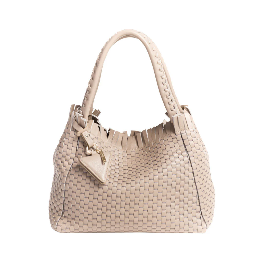 Borsa in pelle fatta a mano in Italia. Design a sacca, con doppio manico caratterizzato da infilatura e bordo superiore con frange di pelle accoppiata. Nasce per essere indossata a braccio, ma la luce del manico consente di portarla anche a spalla.