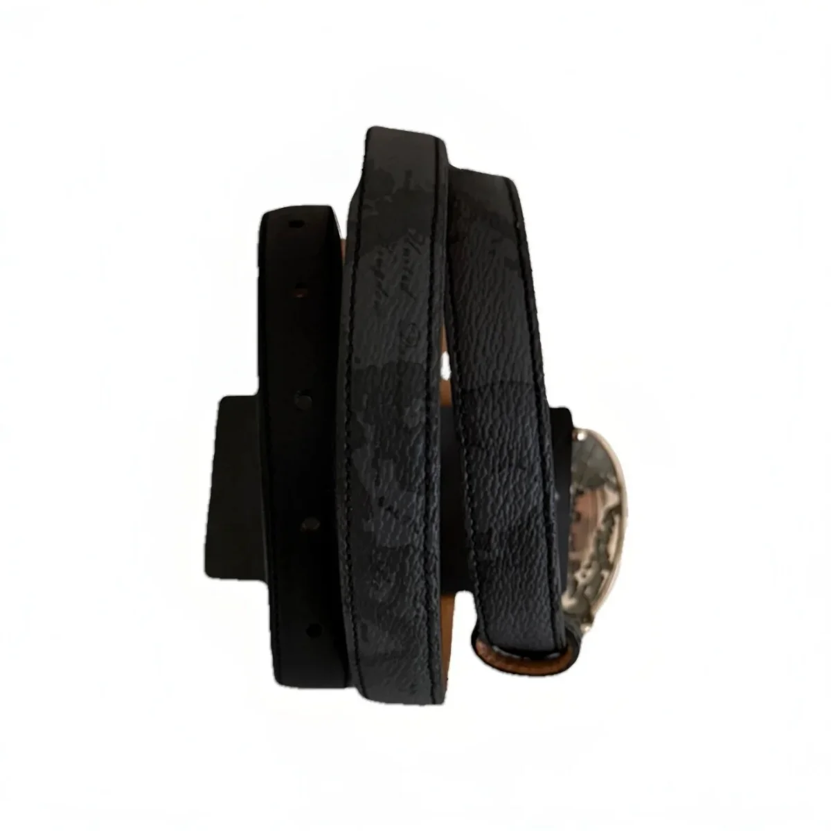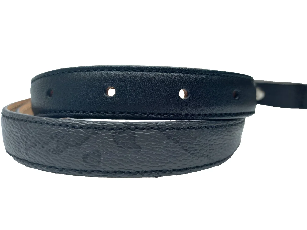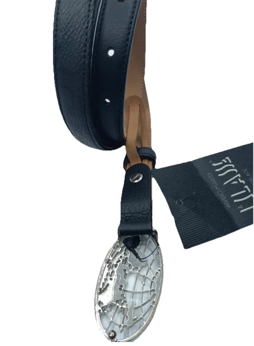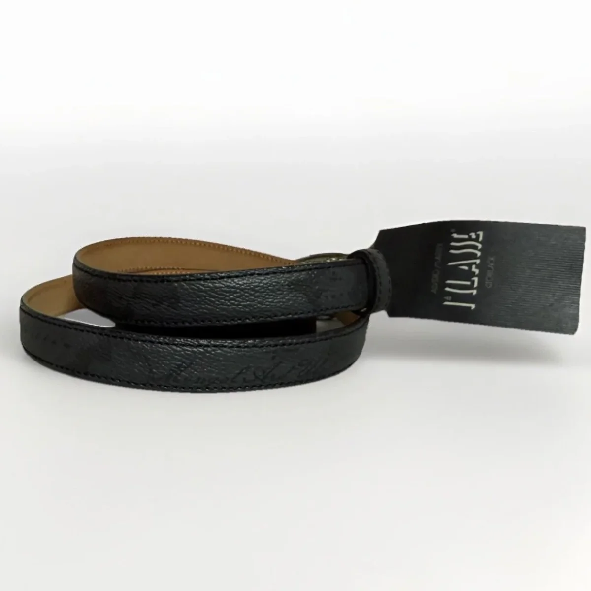 Cintura in goffrato e vera pelle con stampa geo black Fibbia ovale in metallo con logo impresso Taglia 95 cm o taglia 105 cm Cintura accorciabile Altezza 2 cm Made in Italy