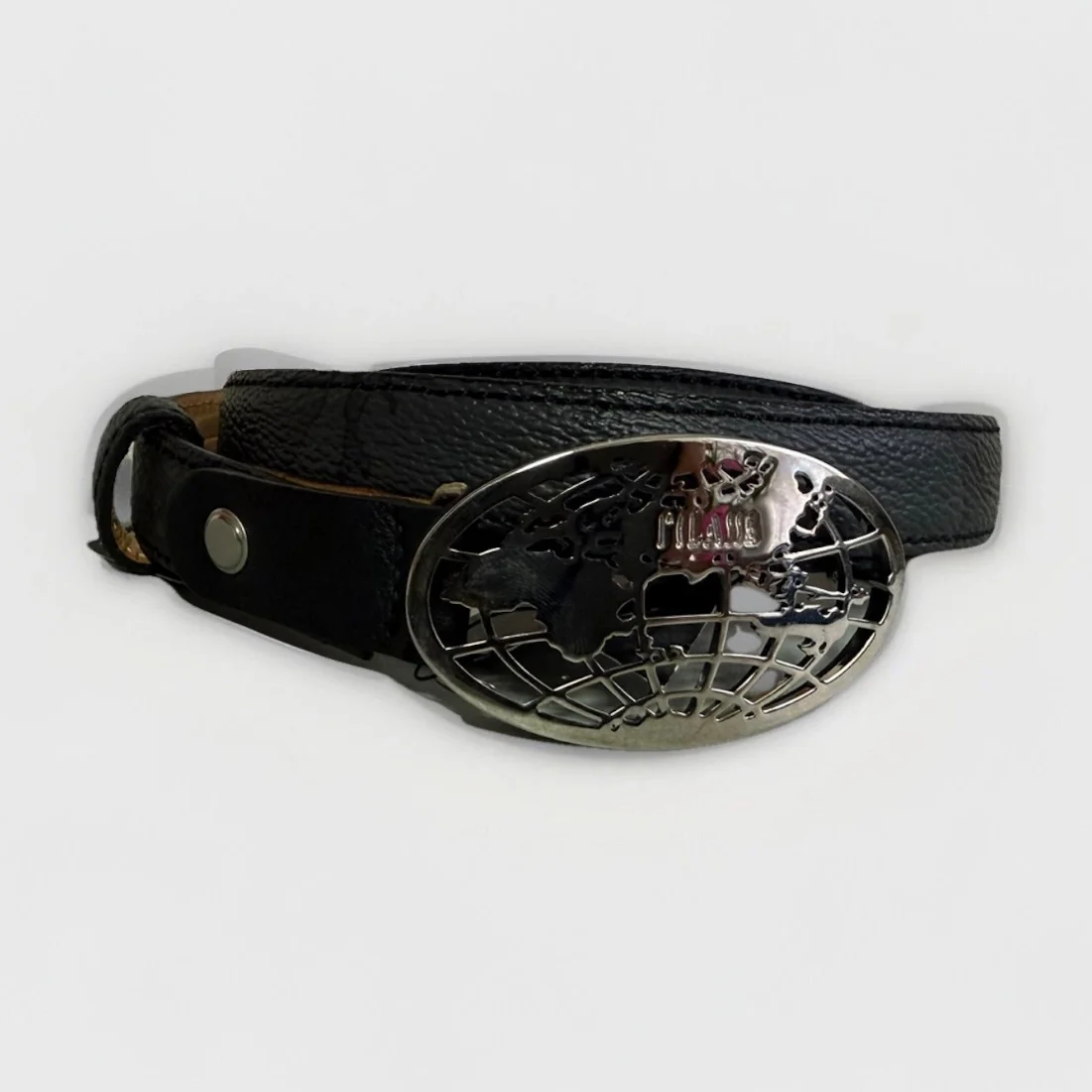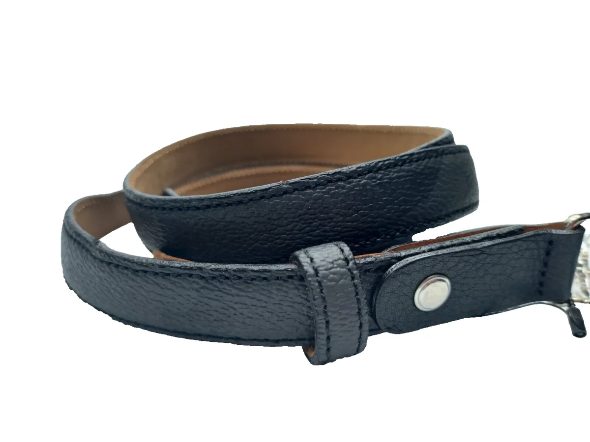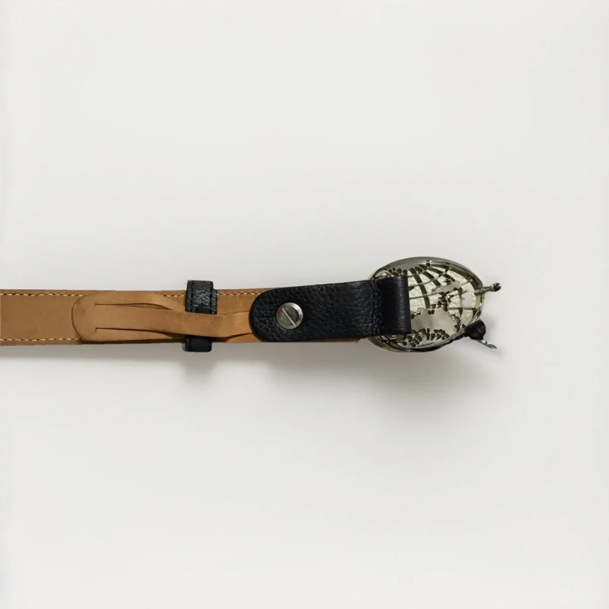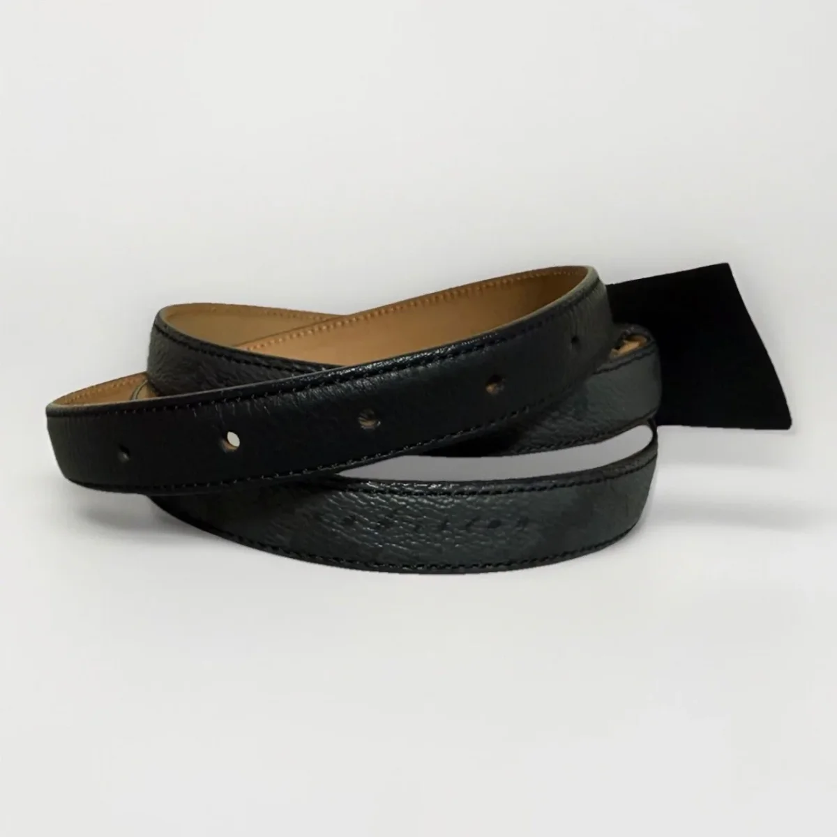 Cintura in goffrato e vera pelle con stampa geo black Fibbia ovale in metallo con logo impresso Taglia 95 cm o taglia 105 cm Cintura accorciabile Altezza 2 cm Made in Italy
