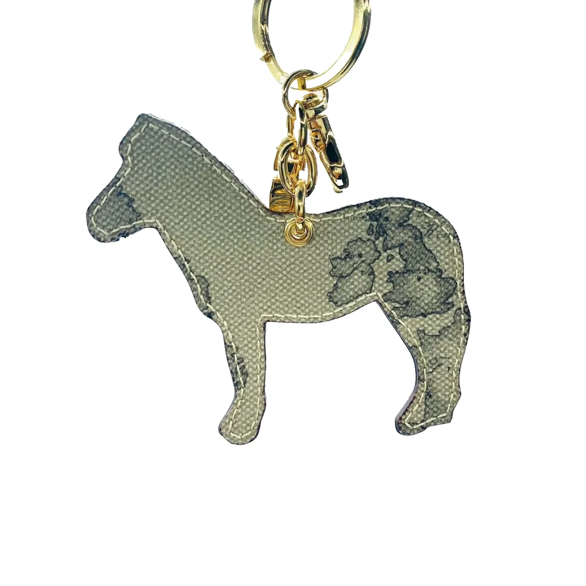 Portachiavi in pelle e goffrato donna zebra o ciondolo borsa Ciondolo da borsa con Moschettone Anello per chiavi Metalleria con logo prima classe Finiture in oro chiaro Riporti e dettagli in pelle di Vacchetta color Tortora realizzato in tessuto stampato con cartina geografica Geo Tortora Made in italy