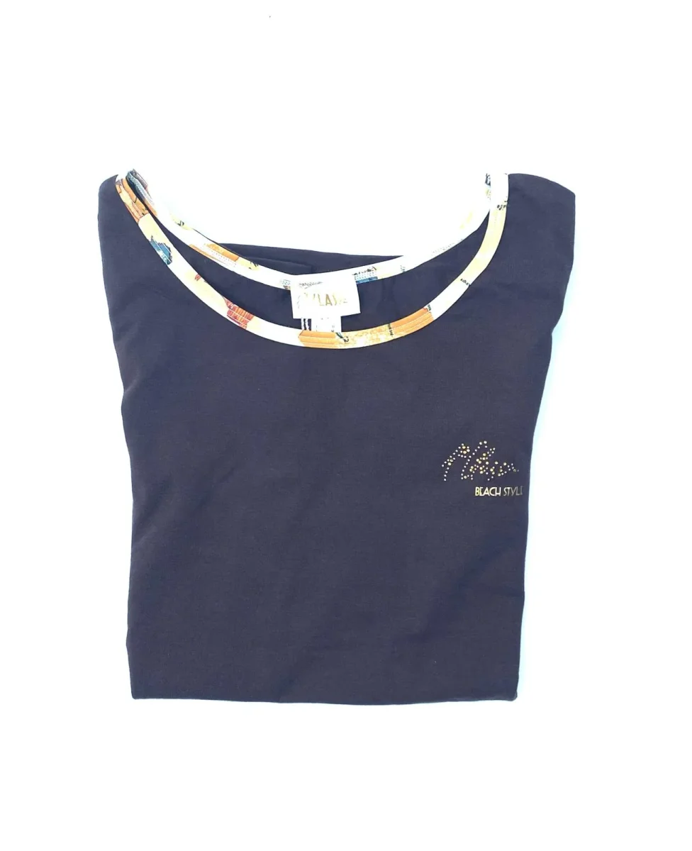 T-Shirt Alviero Martini in tessuto 93% cotone 7% elastano di colore marrone con bordo fantasia geo risulta pratica e di tendenza da indossare sopra il costume o per le calde giornate estive