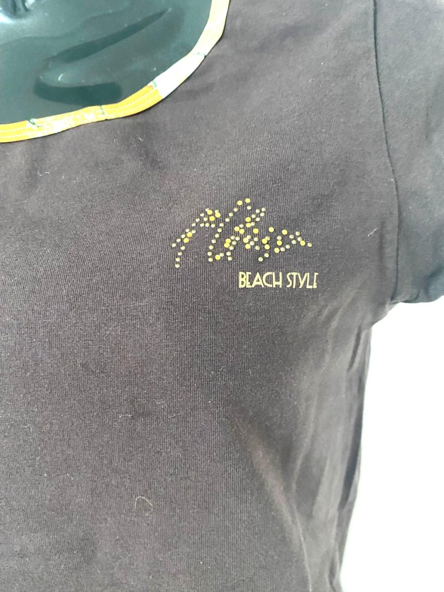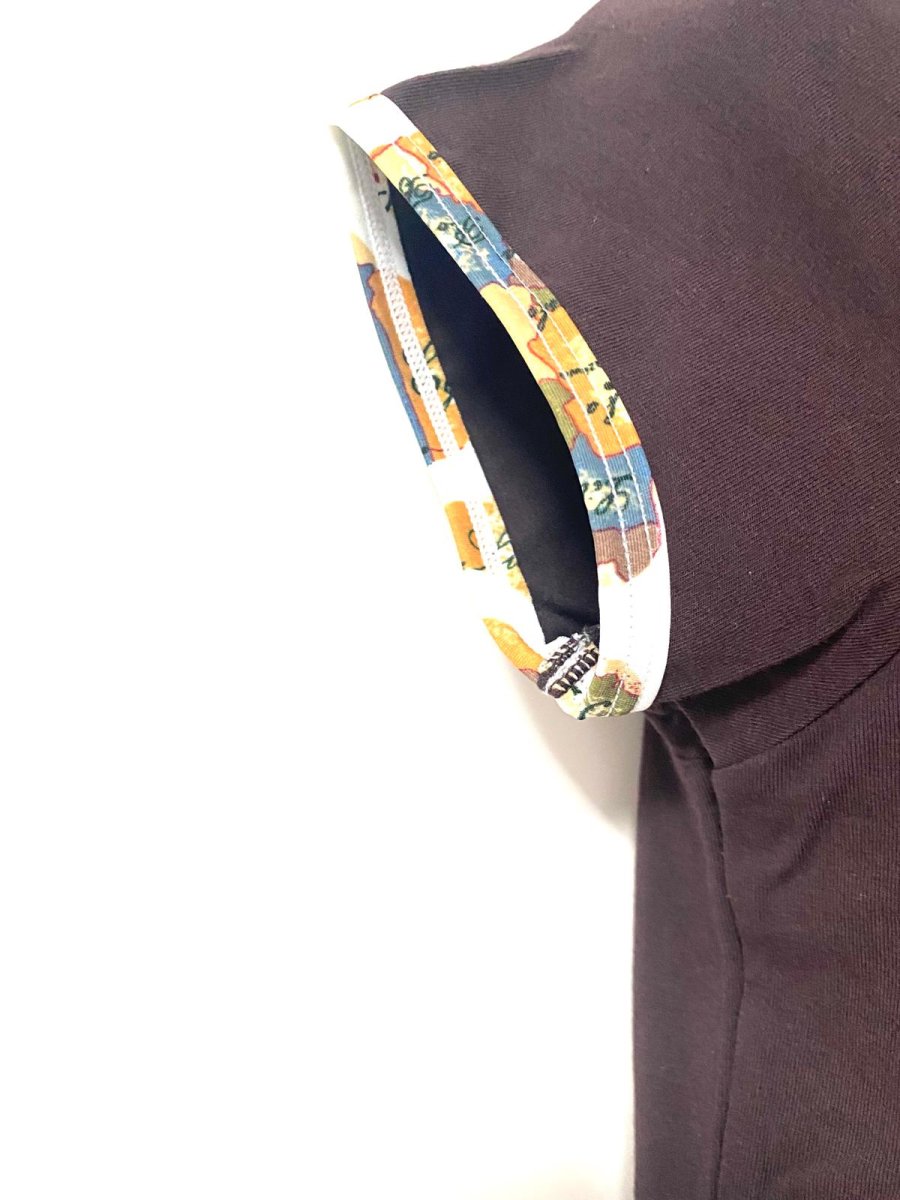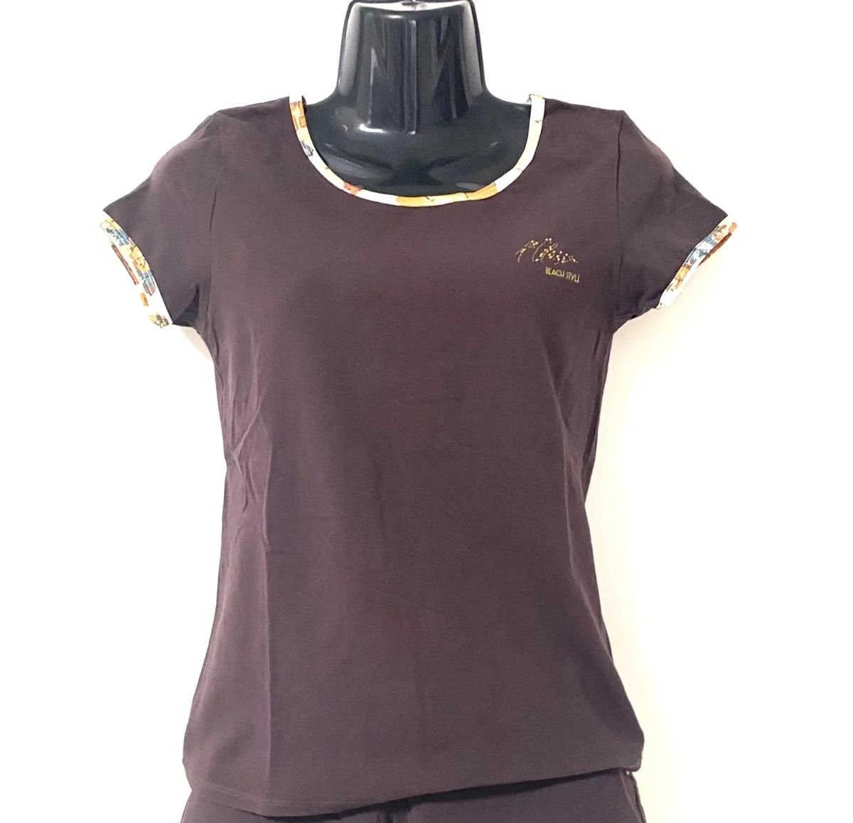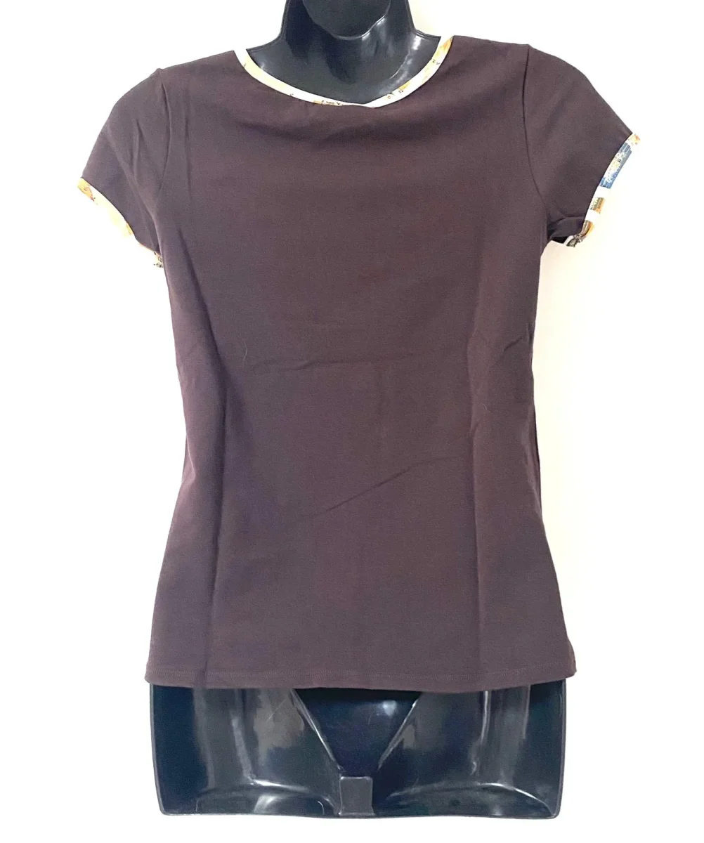 T-Shirt Alviero Martini in tessuto 93% cotone 7% elastano di colore marrone con bordo fantasia geo risulta pratica e di tendenza da indossare sopra il costume o per le calde giornate estive Possibilità di abbinare la T-Shirt ai pantaloncini abbinati con la stessa fantasia Taglia S / L Made in Italia