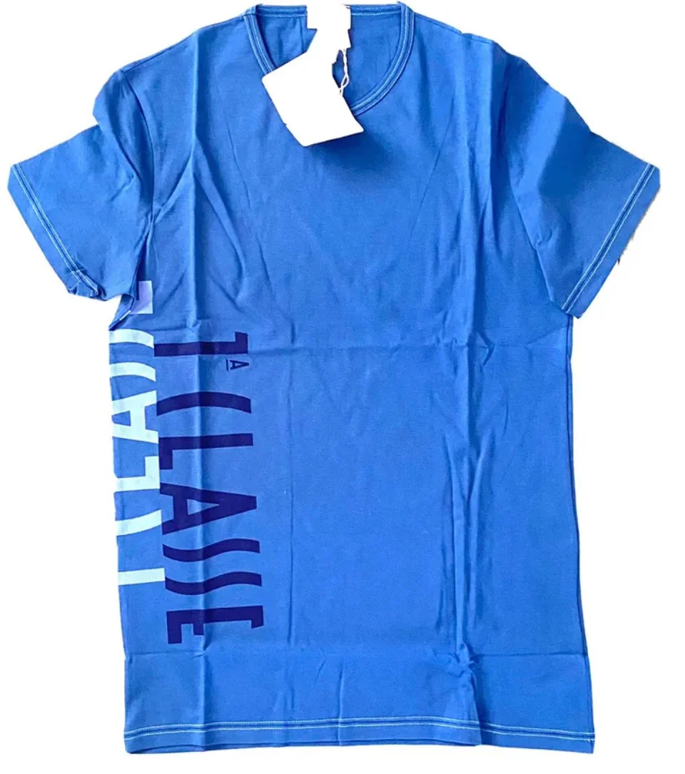 T-Shirt Alviero Martini in tessuto 95% cotone 5% elastano di colore blu con logo 1^ CLASSE sulla parte destra della t- Shirt risulta pratica e di tendenza da indossare Taglia S misura spalle 38cm lunghezza 66 cm Made in Italia |