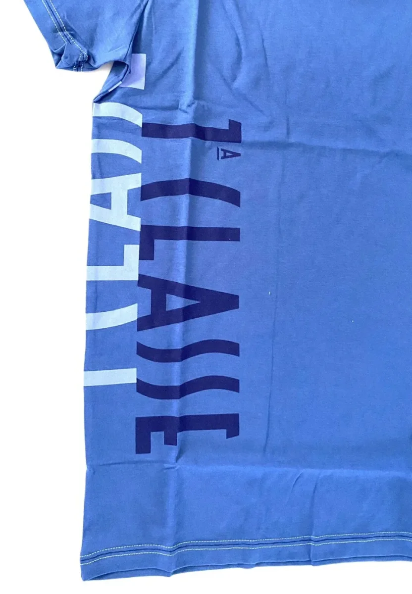T-Shirt Alviero Martini in tessuto 95% cotone 5% elastano di colore blu con logo 1^ CLASSE sulla parte destra della t- Shirt risulta pratica e di tendenza da indossare Taglia S misura spalle 38cm lunghezza 66 cm Made in Italia