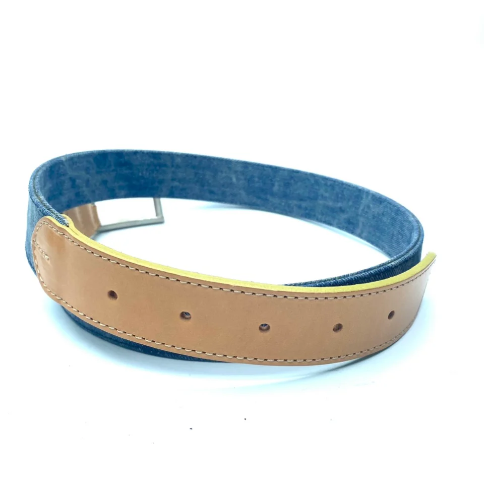 Cintura donna in cuoio e tessuto jeans e fibbia in metallo.