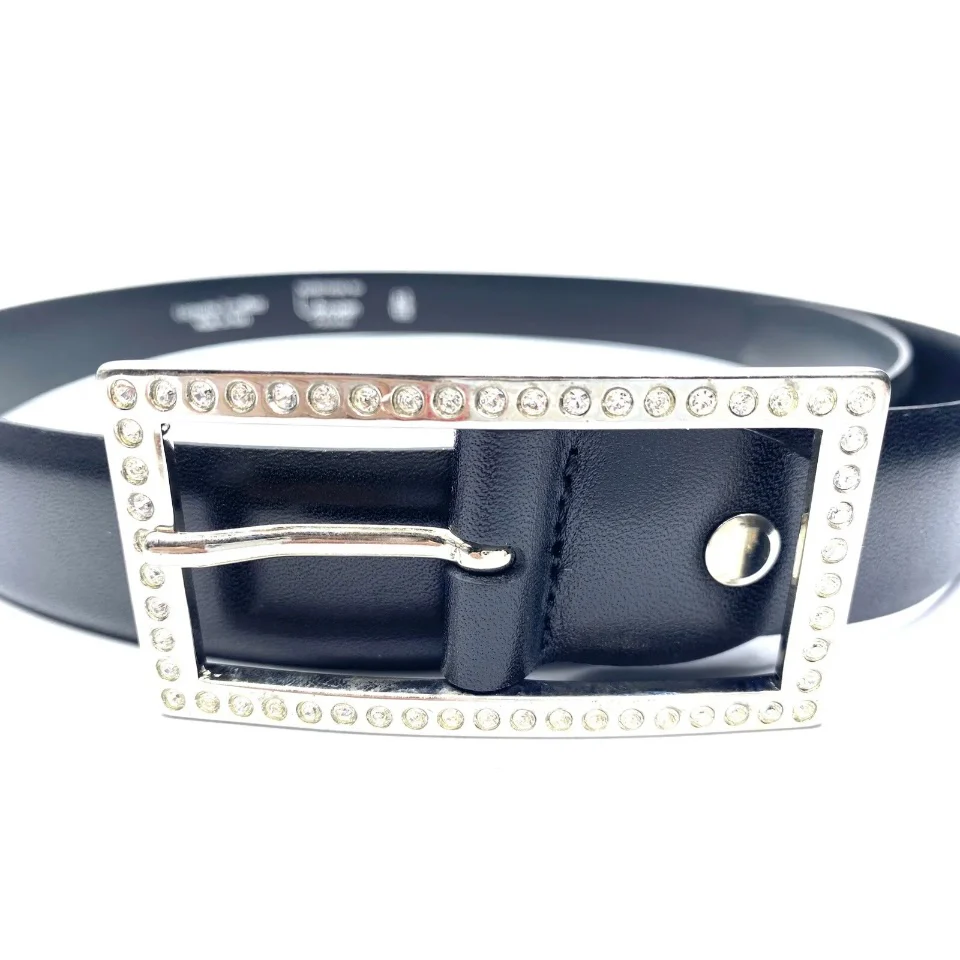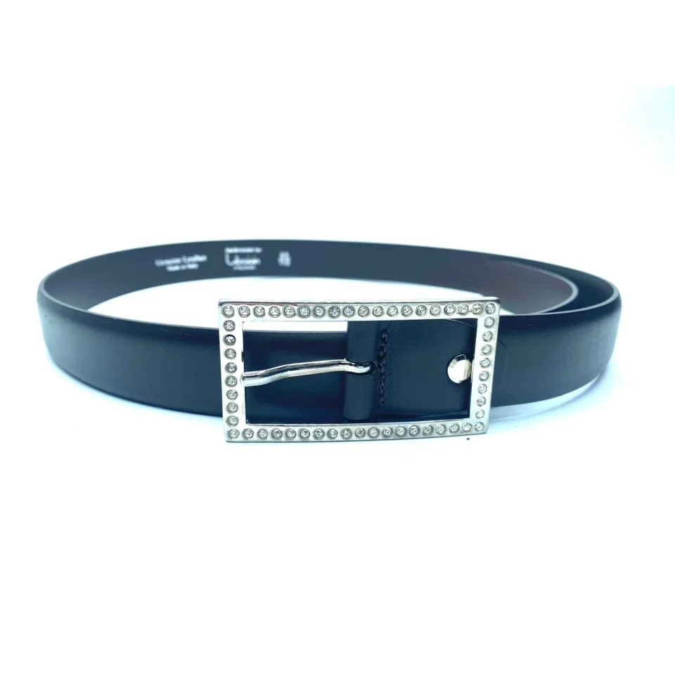 Bellissima cintura in vera pelle liscia nera e fibbia in metallo con strass