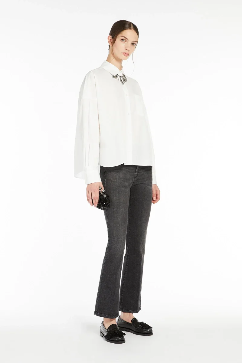 Camicia oversize, realizzata in popeline di puro cotone. Il modello è caratterizzato da colletto classico, maniche lunghe a giro basso, polsi con bottone e taschino applicato sul petto. Rifinita con taglio carré sul retro e fondo stondato asimmetrico leggermente più lungo sul retro. Chiusura con bottoni. Il tessuto principale di questo capo contiene almeno il […]