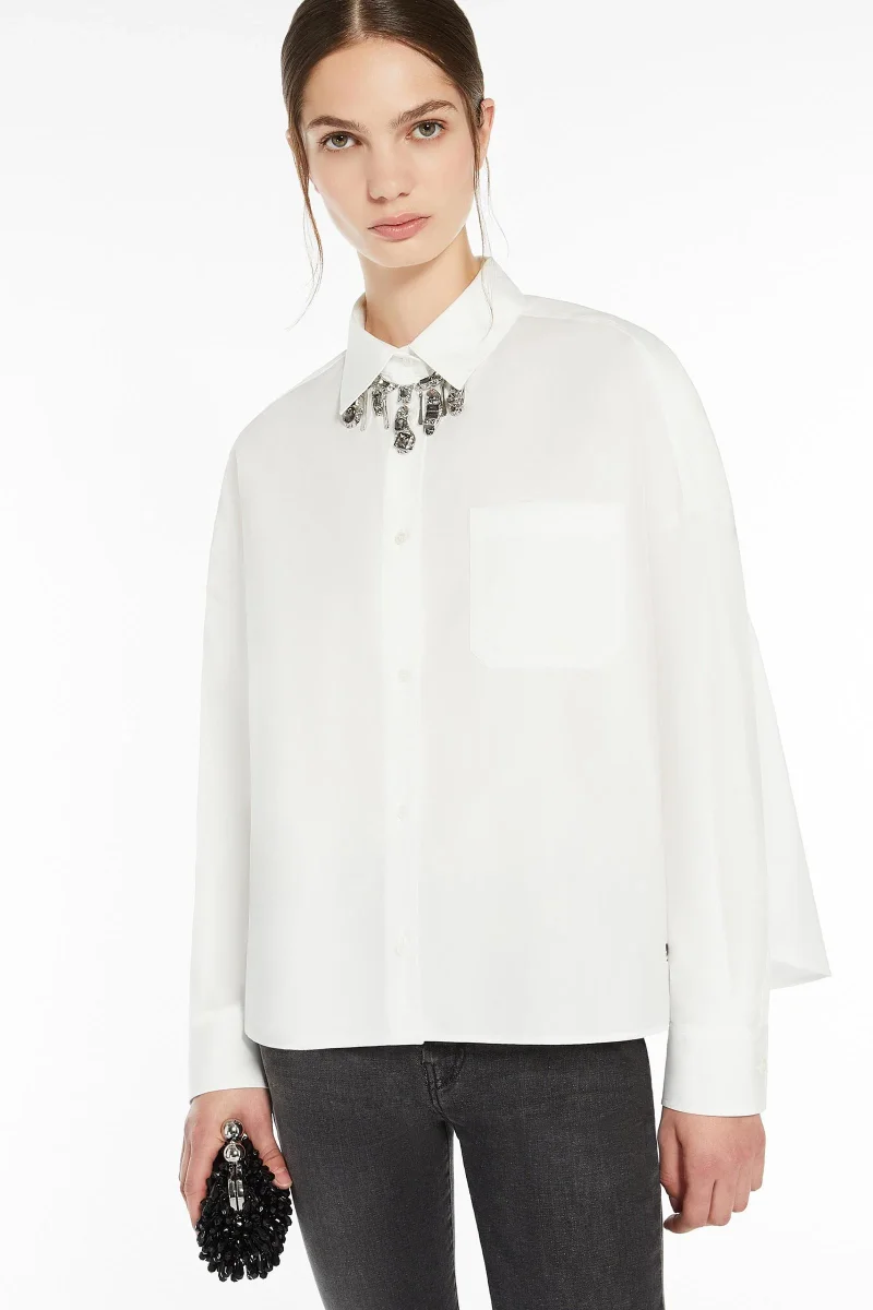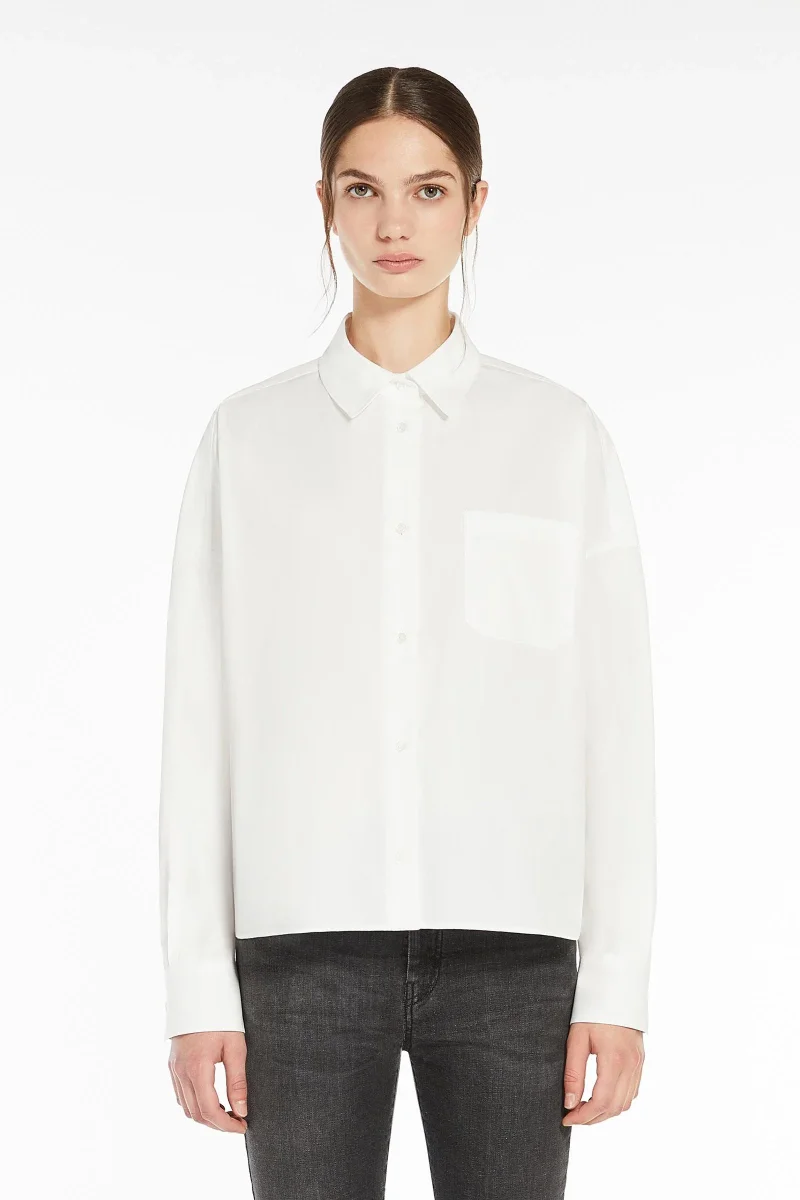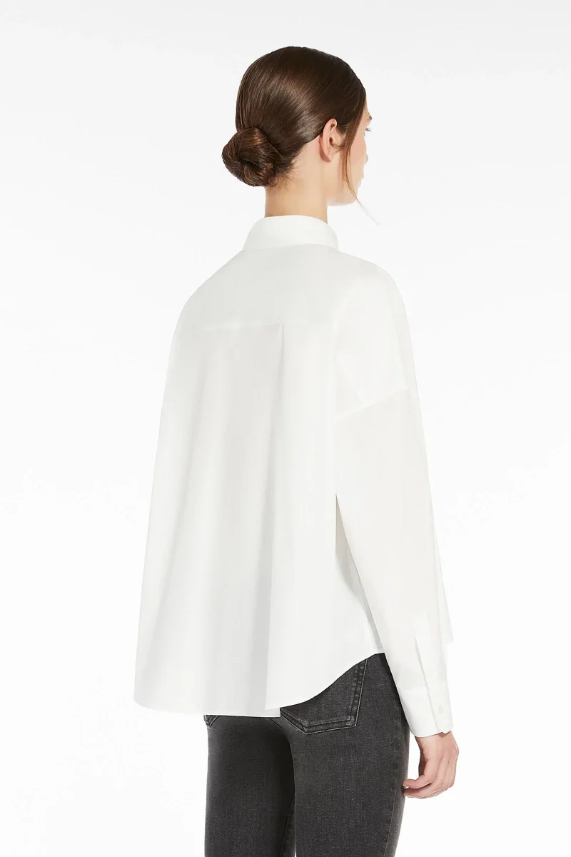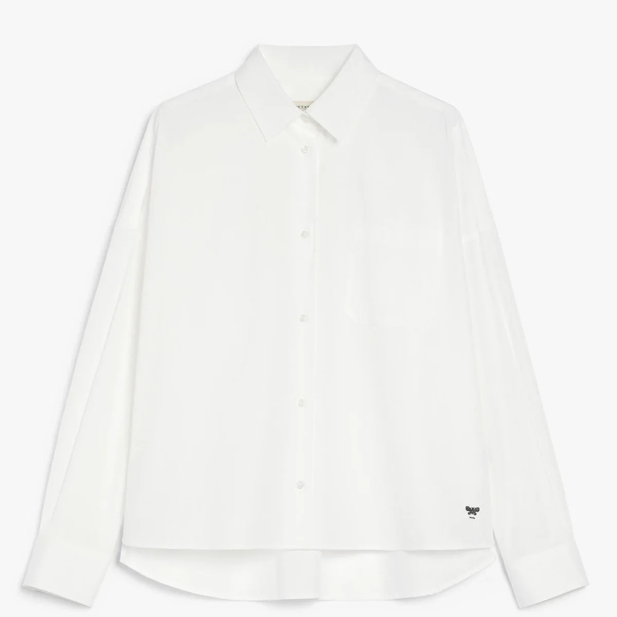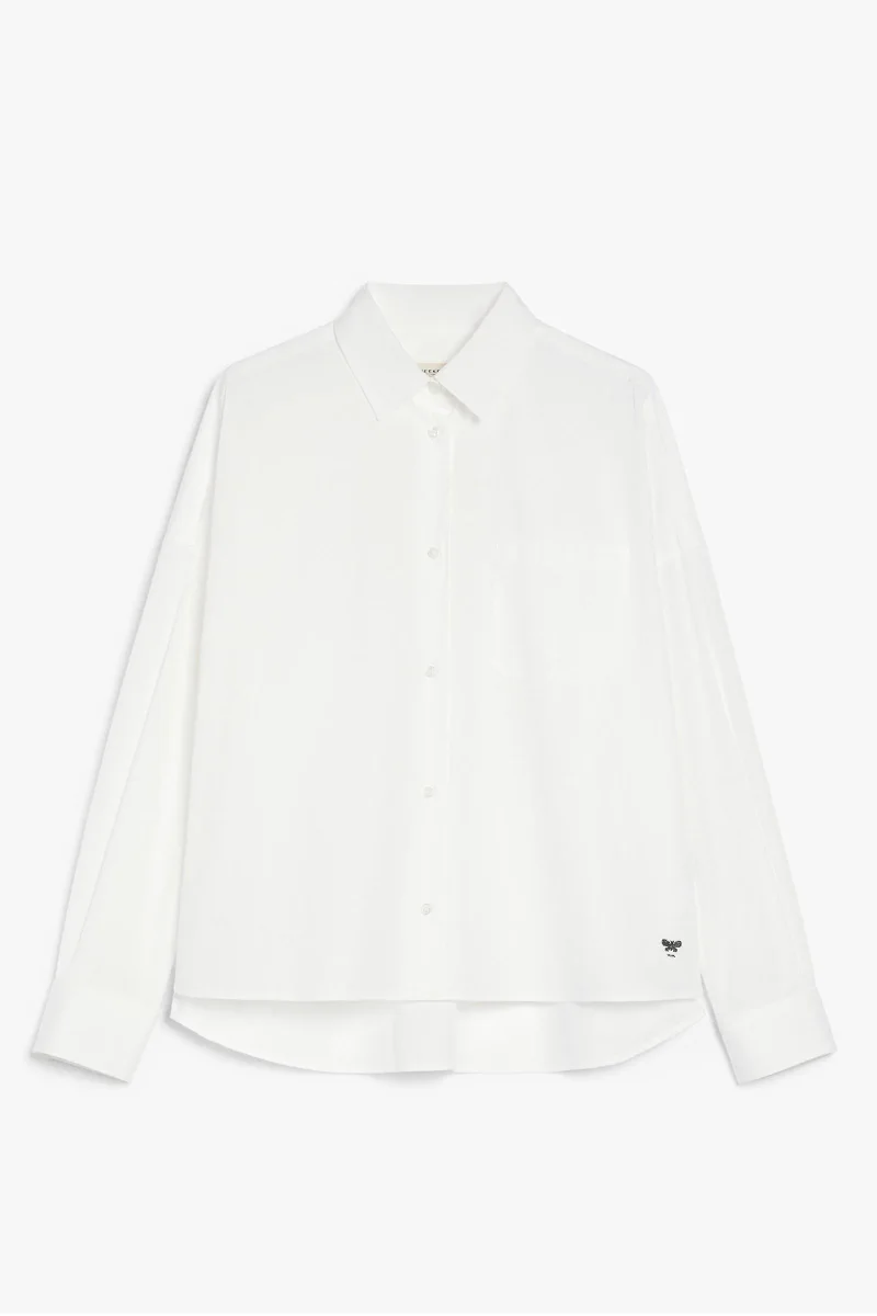 Camicia oversize, realizzata in popeline di puro cotone. Il modello è caratterizzato da colletto classico, maniche lunghe a giro basso, polsi con bottone e taschino applicato sul petto. Rifinita con taglio carré sul retro e fondo stondato asimmetrico leggermente più lungo sul retro. Chiusura con bottoni. Il tessuto principale di questo capo contiene almeno il 50% di fibra di cotone coltivata secondo i principi dell’agricoltura biologica.Composizione:100% cotone