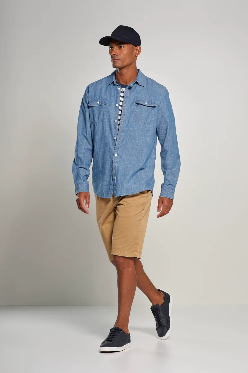 Bermuda chino da uomo, slim fit, perfetti per completare il look estivo con eleganza e praticità. Realizzati in: Gabardina di cotone stretch, tinto e lavato in capo, che garantisce elasticità, resistenza e un comfort ottimale.