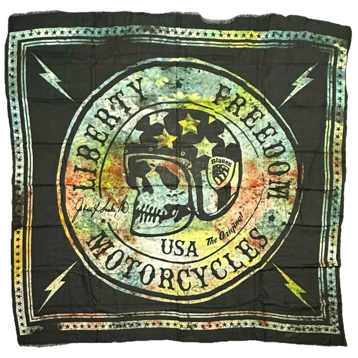 BLAUER sciarpa con un design che incorpora il logo “Blauer” e un’illustrazione di un teschio con un casco, circondato dalle parole “LIBERTY”, “FREEDOM” e “MOTORCYCLES USA”.