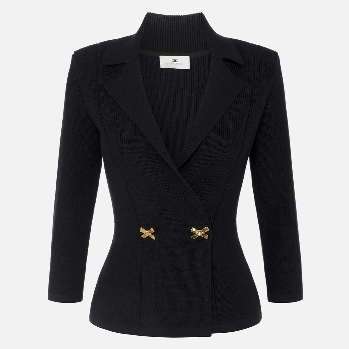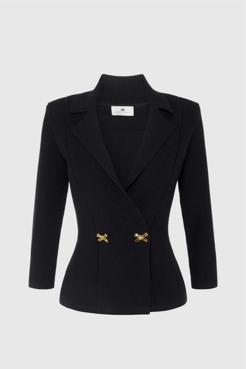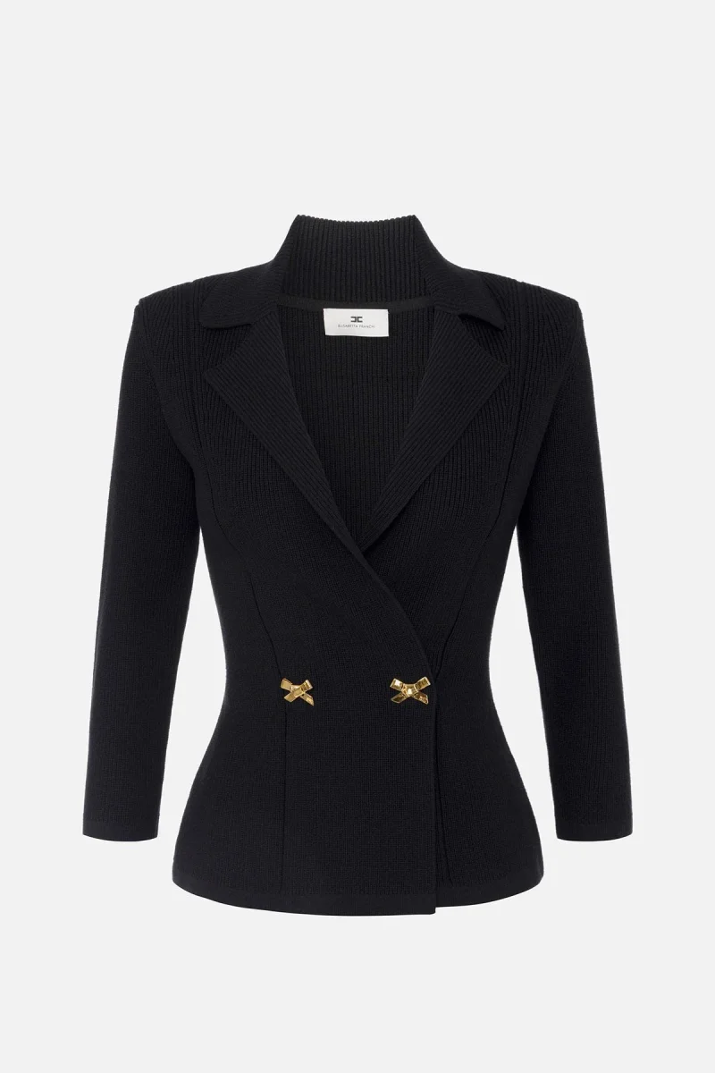 Blazer in maglia punto pannocchia, impreziosito da fiocchi gioiello in metallo dorato con logo. Ha rever classico, maniche 7/8 e chiusura doppiopetto. Vestibilità aderente.Composizione:68%Viscosa 27%Poliestere 05%Poliammide