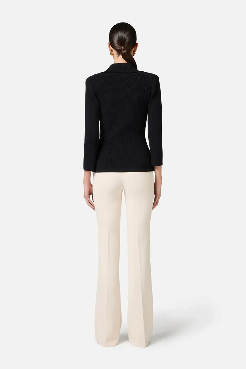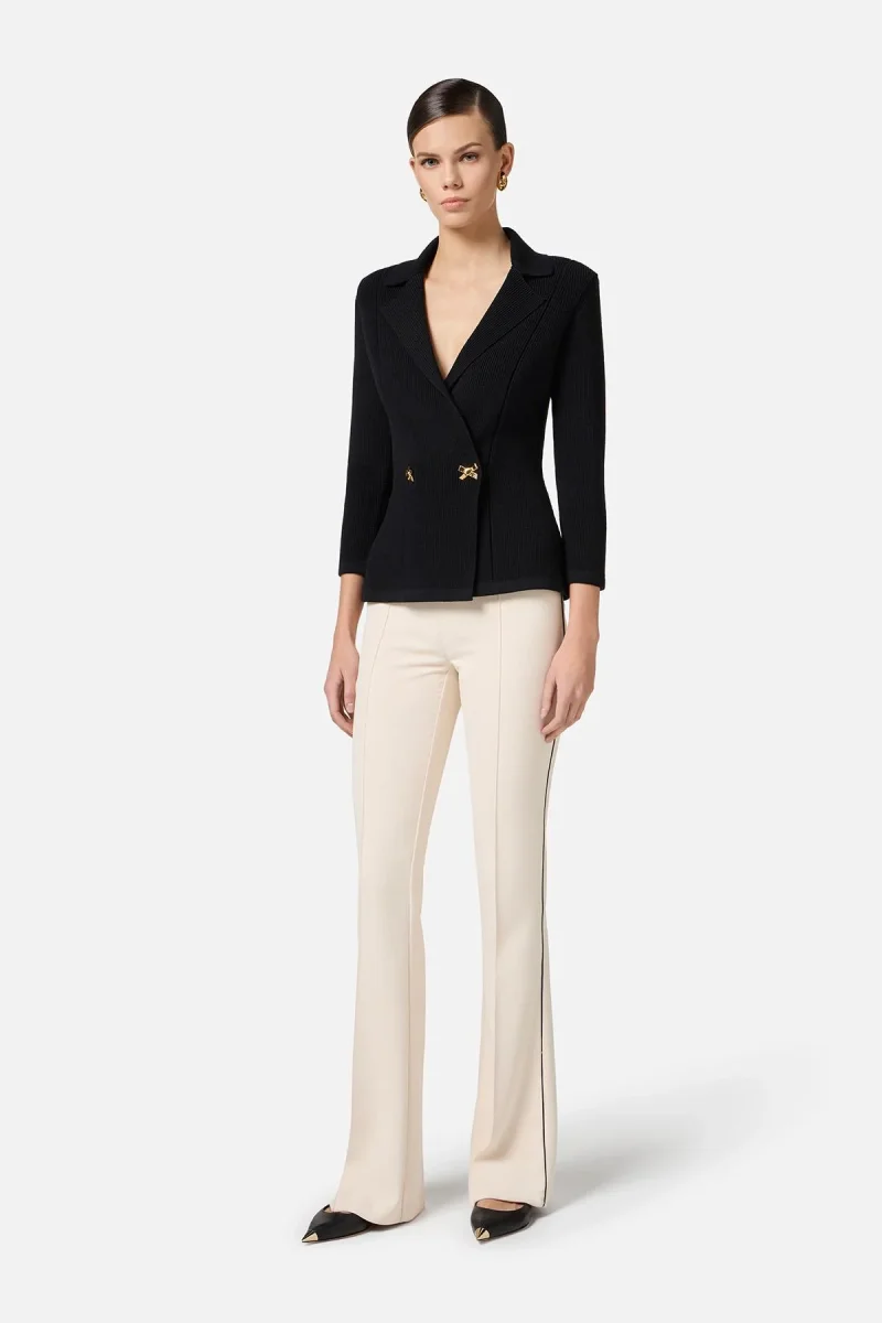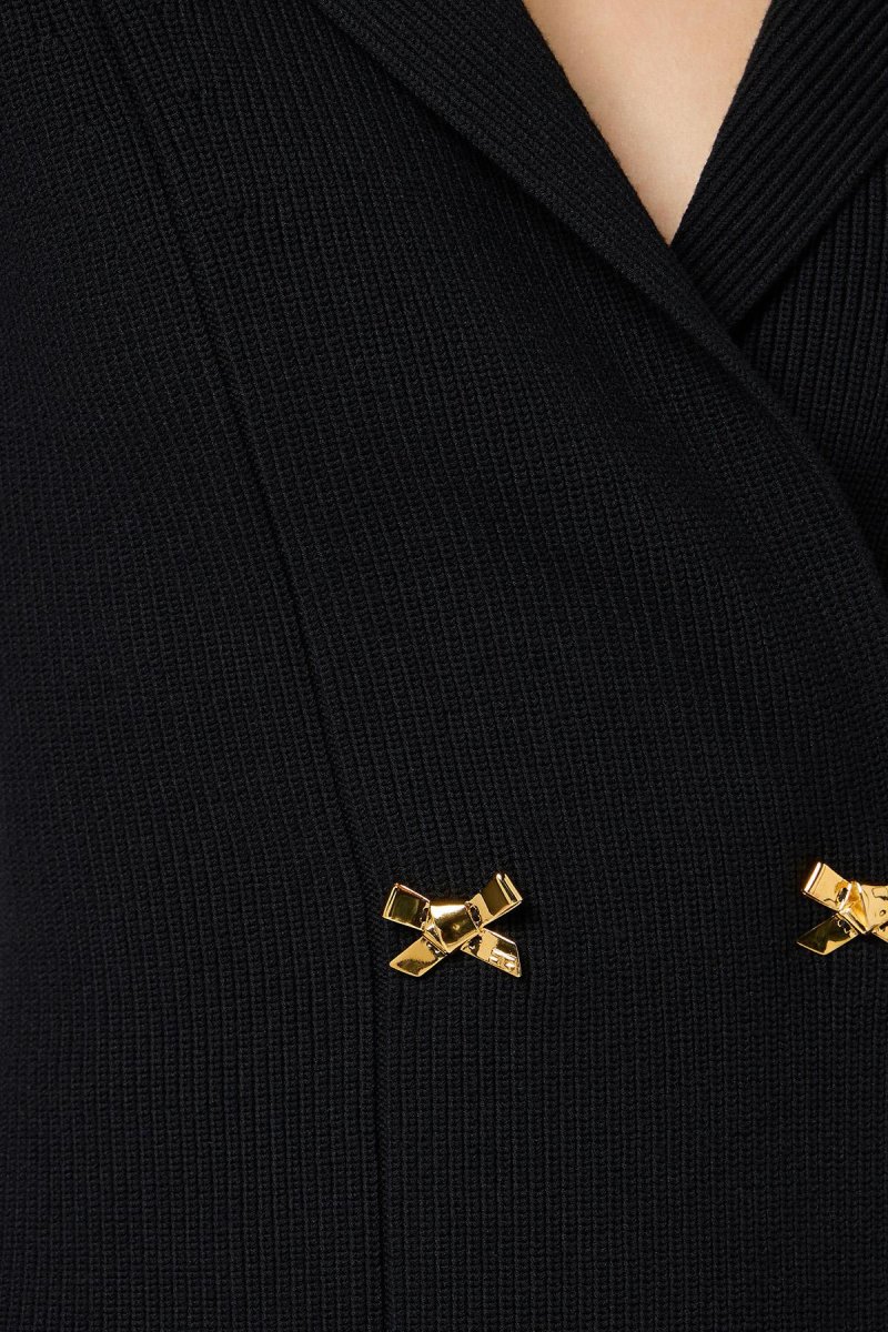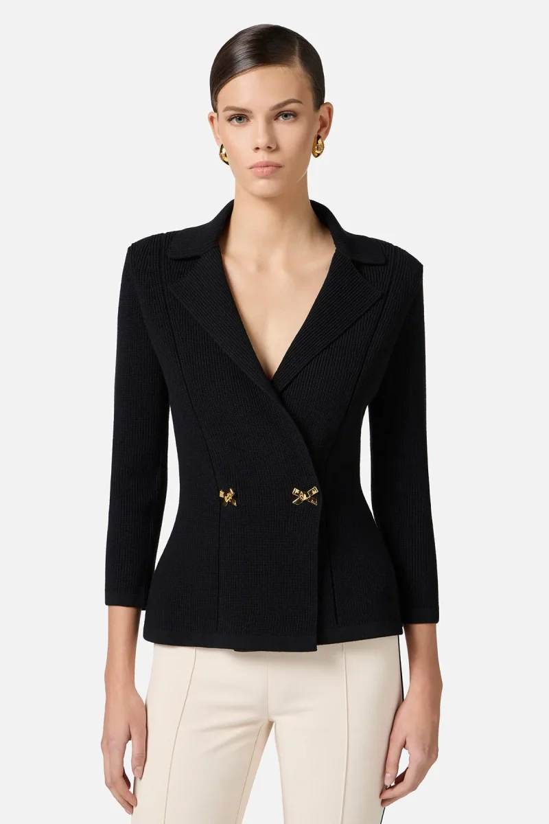 Blazer in maglia punto pannocchia, impreziosito da fiocchi gioiello in metallo dorato con logo. Ha rever classico, maniche 7/8 e chiusura doppiopetto. Vestibilità aderente.Composizione:68%Viscosa 27%Poliestere 05%Poliammide