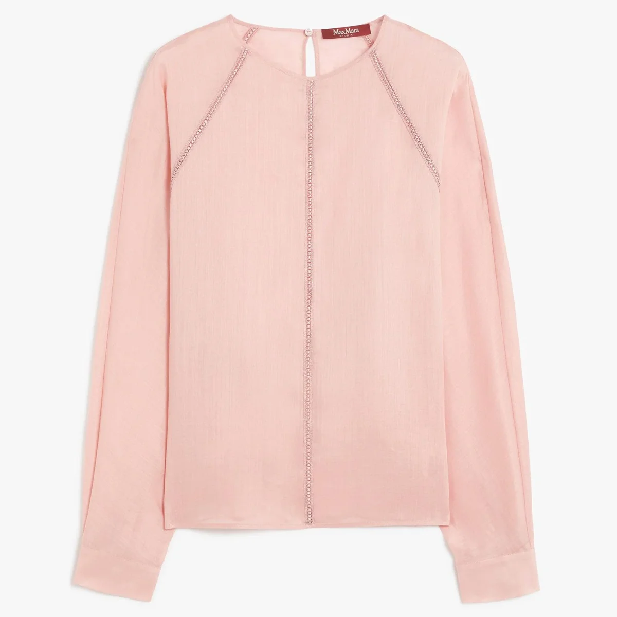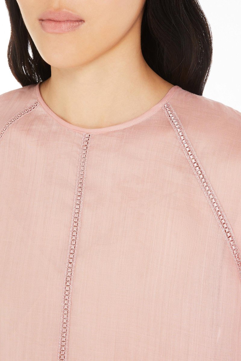 Blusa girocollo in leggera garza ramiè, impreziosita da intarsi in pizzo macramè sul davanti e nei tagli raglan. Modello dalla silhouette morbida con maniche ampie, polsino a camicia con bottoni a sfera in metallo e sottoveste abbinata in jersey.Camicia 100% ramie. Top in jersey 80% poliammide, 20% elastan.