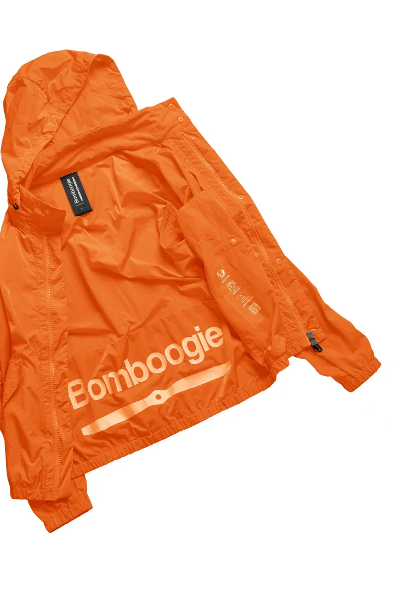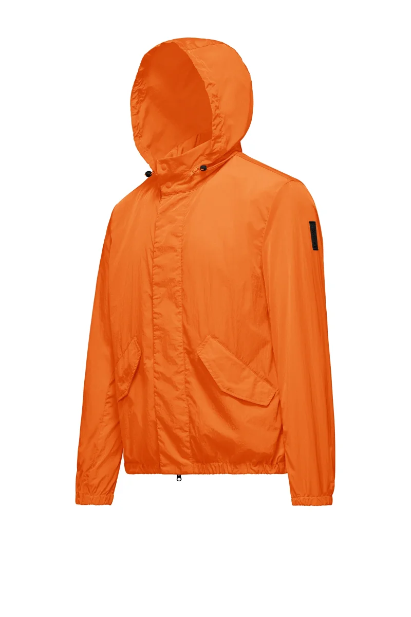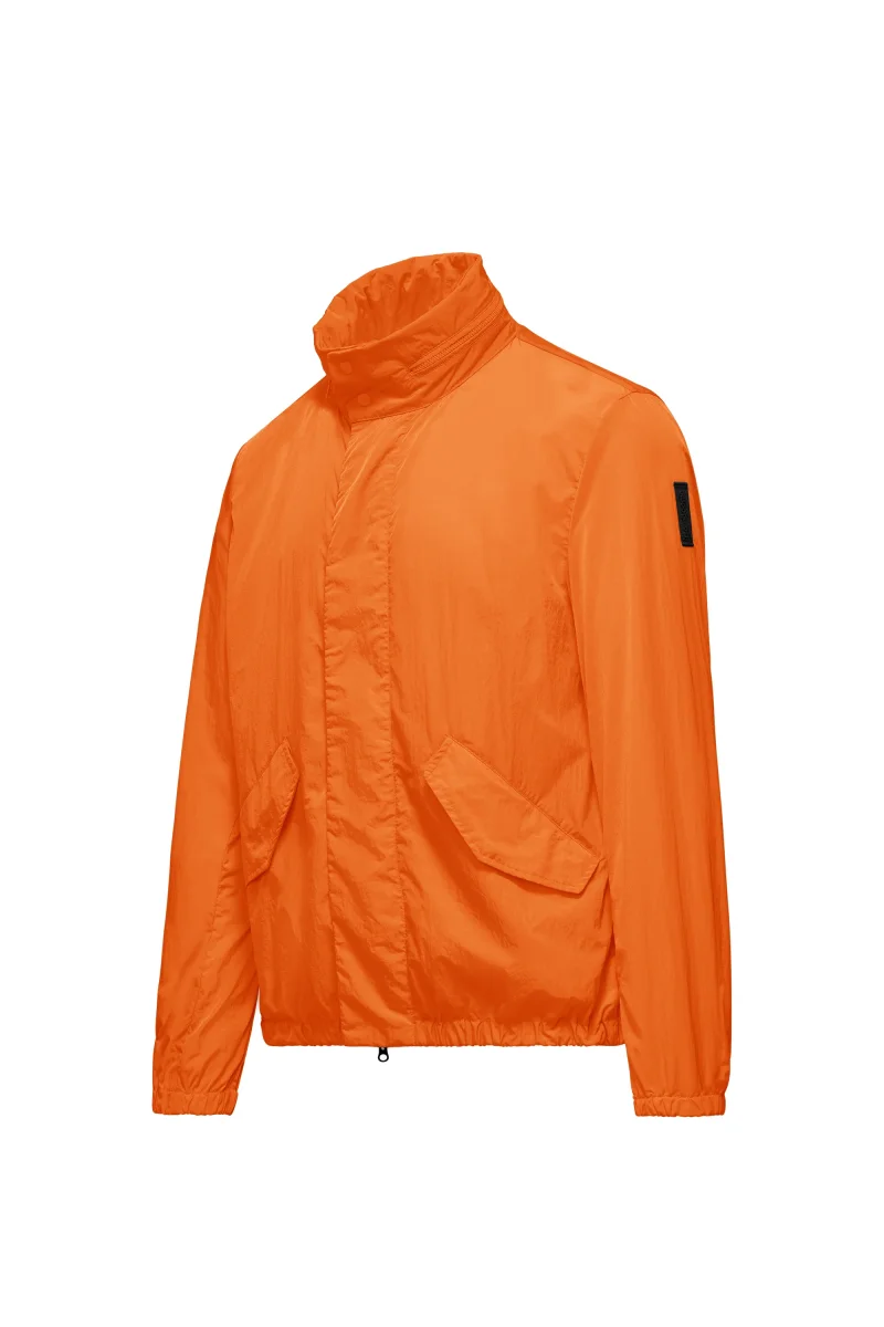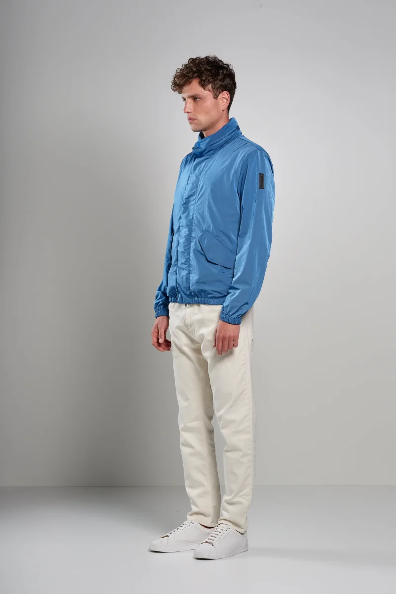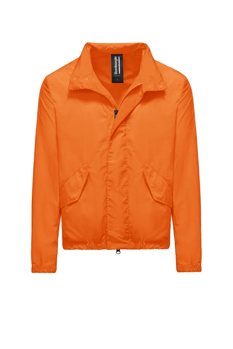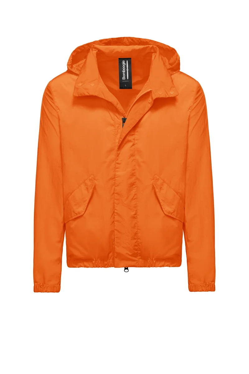Bomber in nylon increspato, antipioggia e antivento. Modello sfoderato, leggero e versatile, con cappuccio nascosto.
