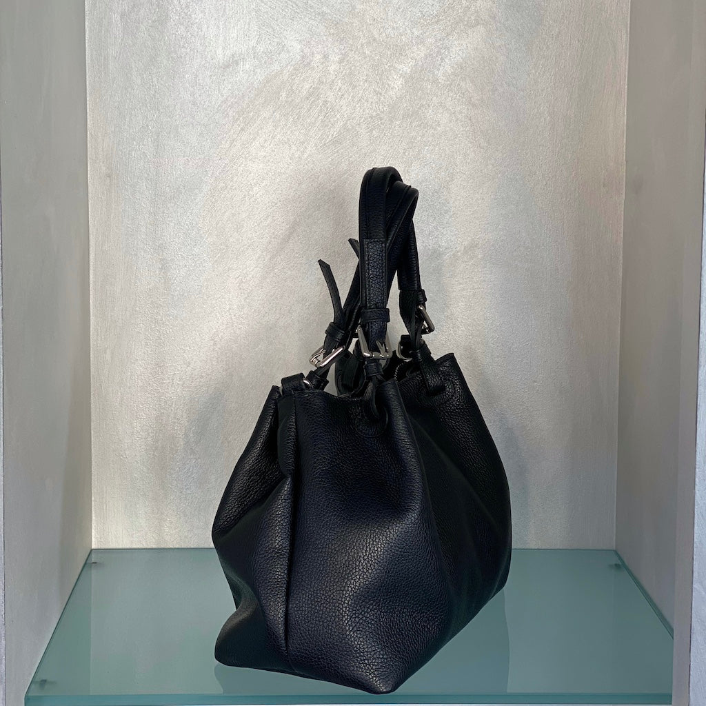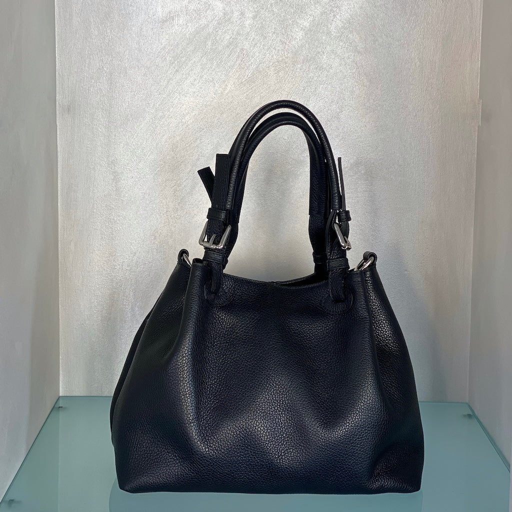 Borsa in pelle a due manici con pinces da indossare a mano o a spalla. Dotata di una tracolla in pelle regolabile per indossare la borsa trasversalmente.