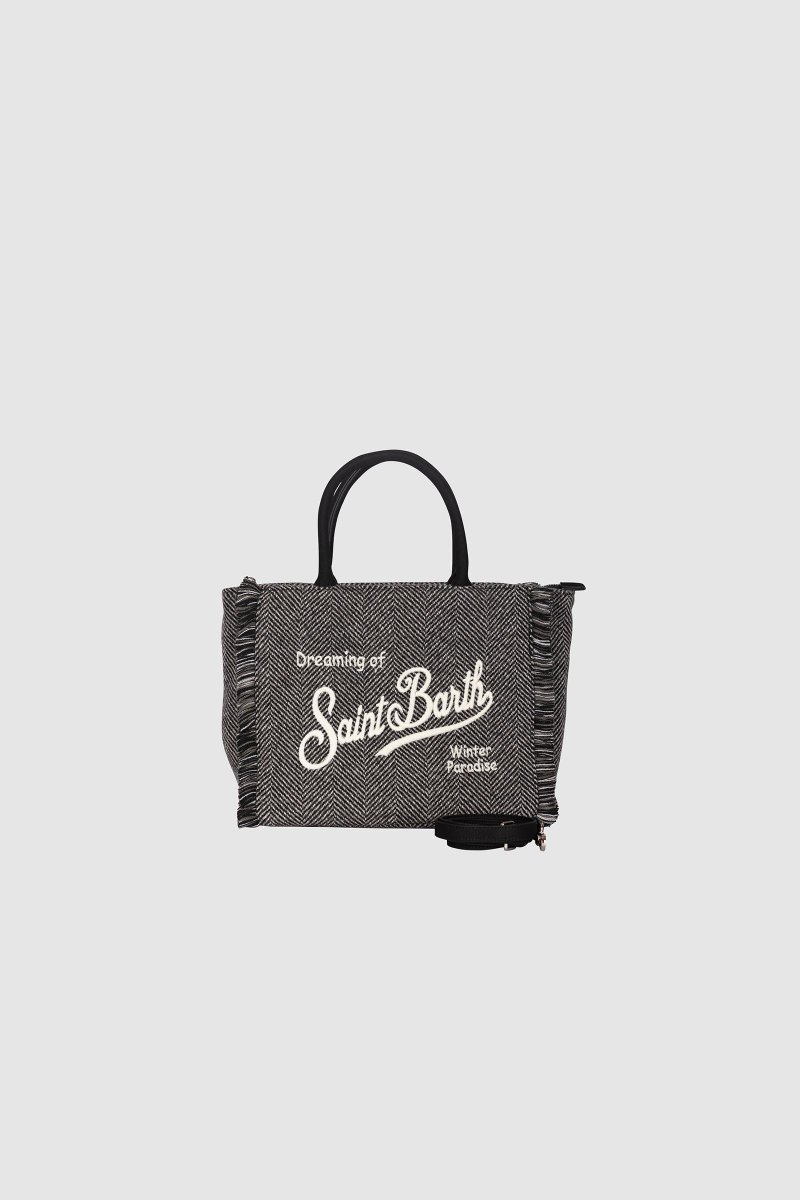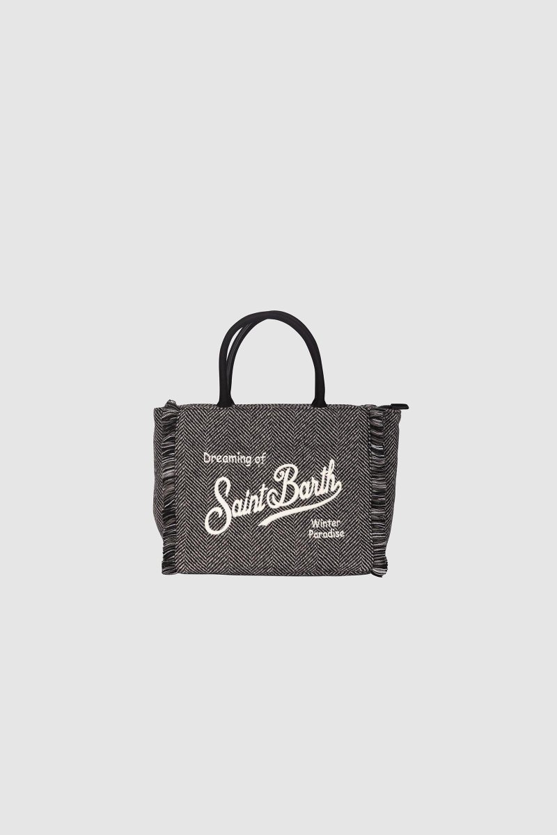 Raffinata e contemporanea, la borsa a mano “Dreaming of Saint Barth – Winter Paradise” è l’accessorio perfetto per chi desidera portare con sé un tocco di eleganza anche nei mesi più freddi. Realizzata in un sofisticato tessuto effetto spina di pesce, questa borsa unisce stile urbano e spirito vacanziero, rendendola ideale per la città così come per le fughe invernali.
