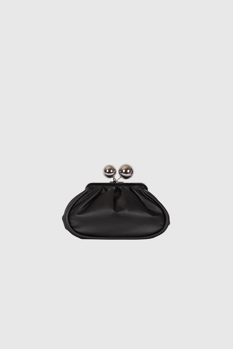 La borsa a mano in pelle nera di Max Mara incarna la raffinata eleganza del brand italiano, combinando stile rétro e modernità. Realizzata in morbida pelle liscia, presenta una silhouette compatta e arrotondata, arricchita da una chiusura a scatto con maxi sfere metalliche che ne definiscono il carattere distintivo.