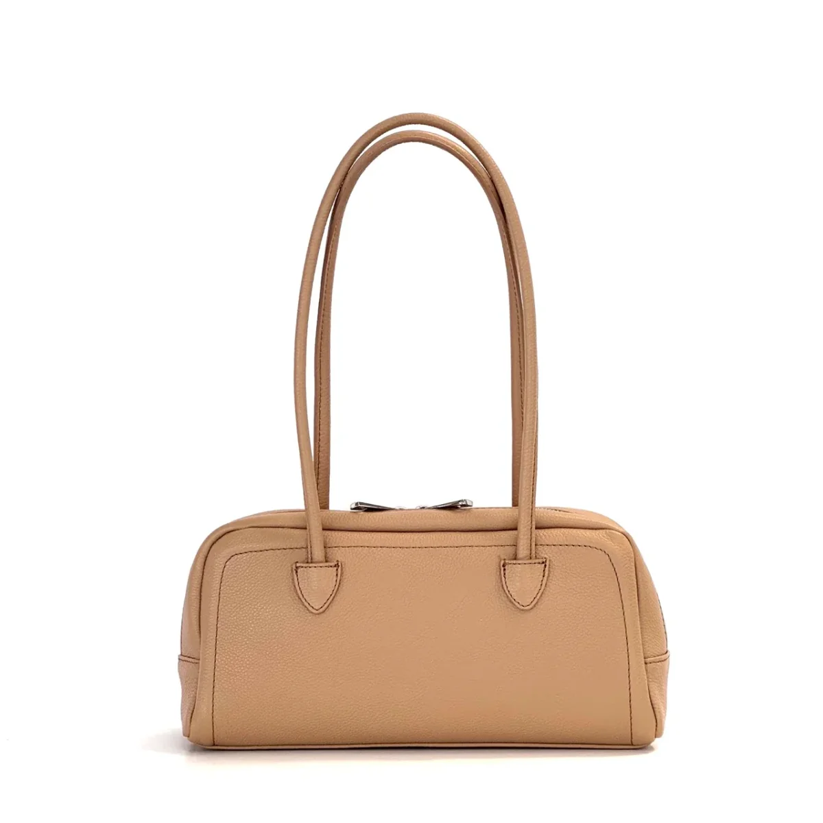 Borsa in pelle a due manici con chiusura a cerniera. Interno foderato con taschine porta oggetti. Portabilità a spalla.