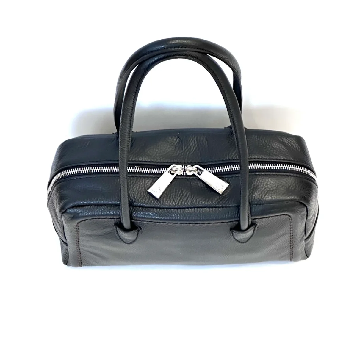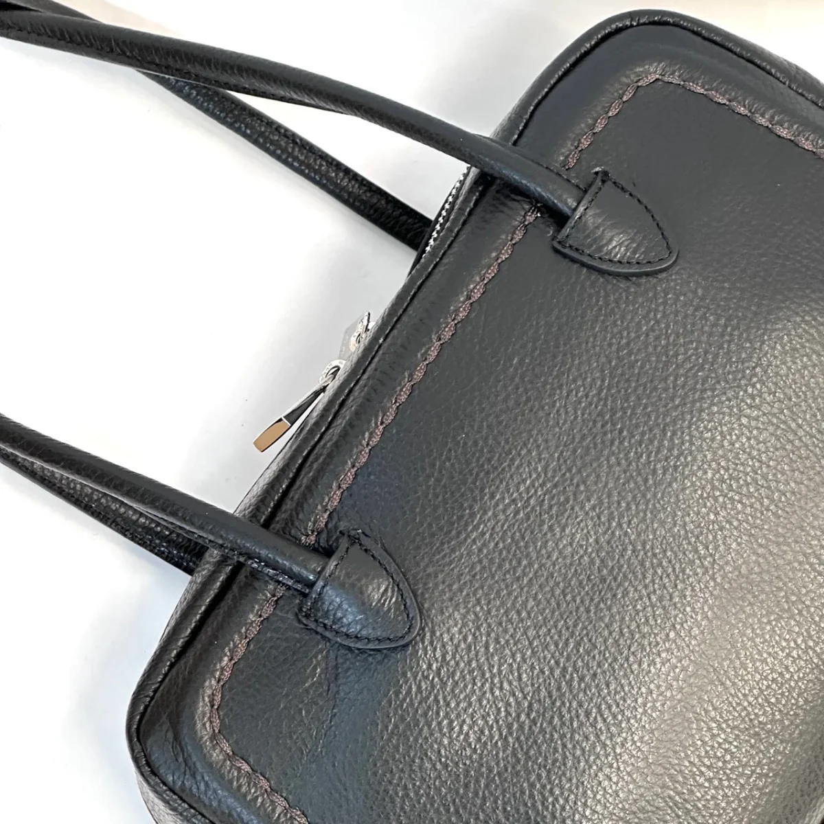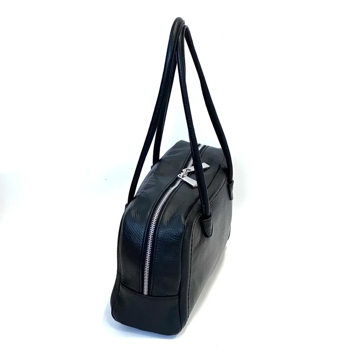 Borsa in pelle martellata a due manici con chiusura a cerniera. Marcapunto in tinta. Interno foderato con taschine porta oggetti. Portabilità a spalla. Misure cm 30 x 18 x 11 Vera pelle made in Italy Colore nero.