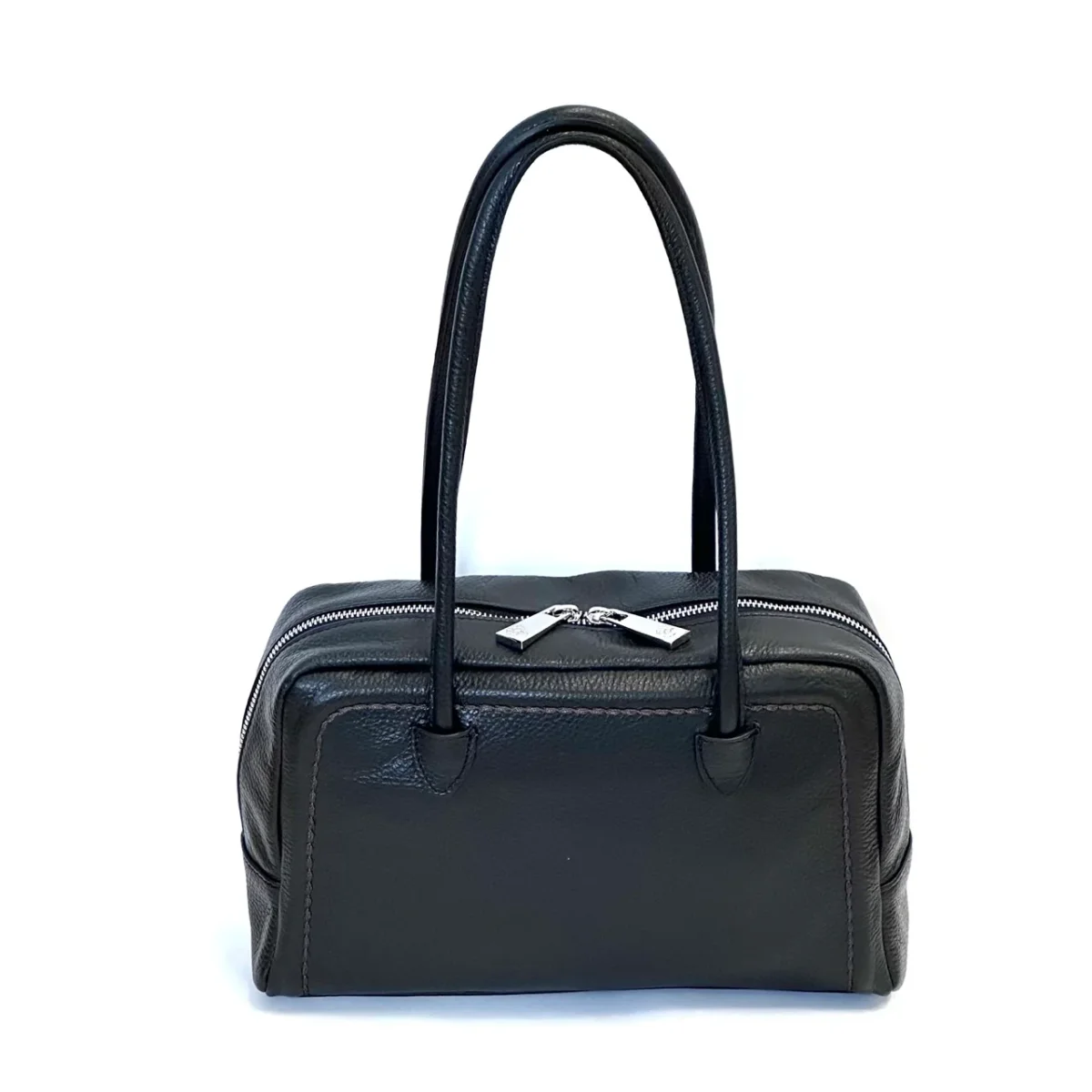 Borsa in pelle martellata a due manici con chiusura a cerniera. Marcapunto in tinta. Interno foderato con taschine porta oggetti. Portabilità a spalla.