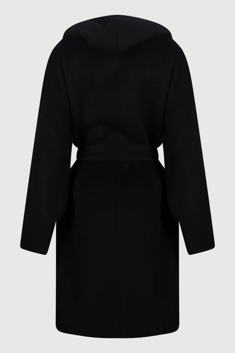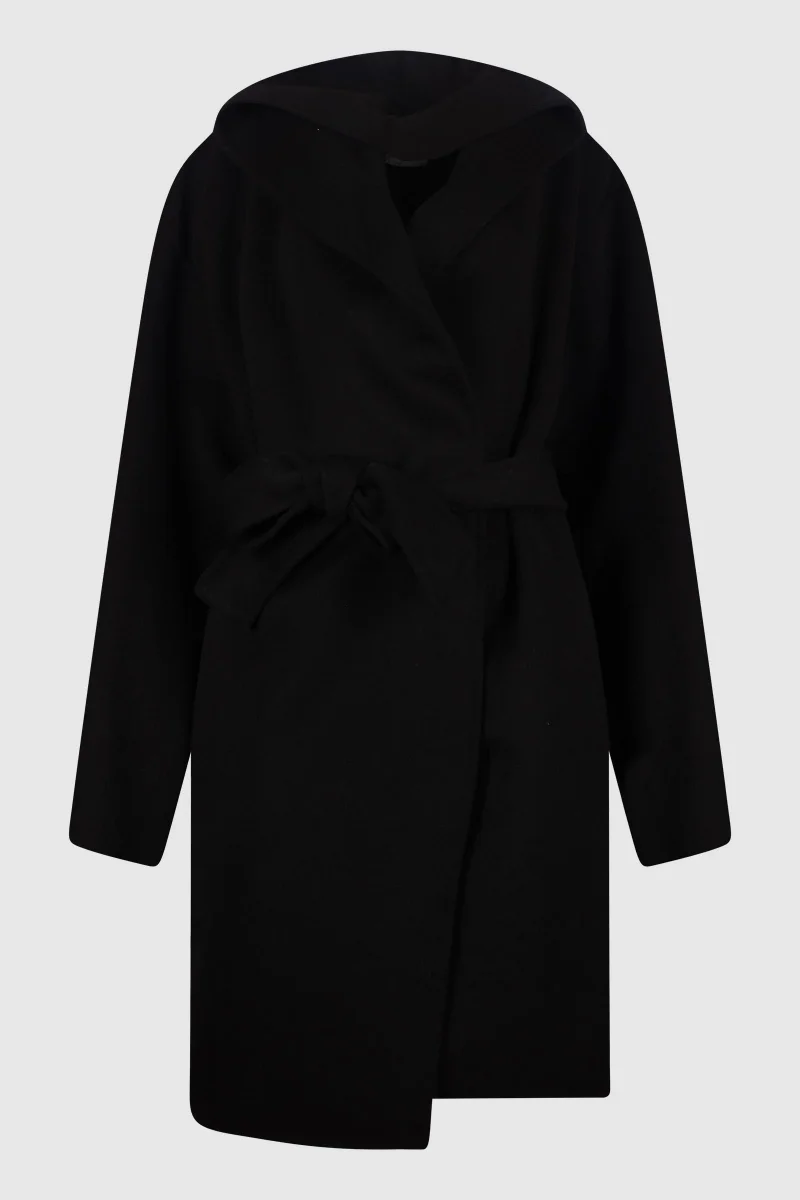Cappotto con cappuccio e cintura in lana