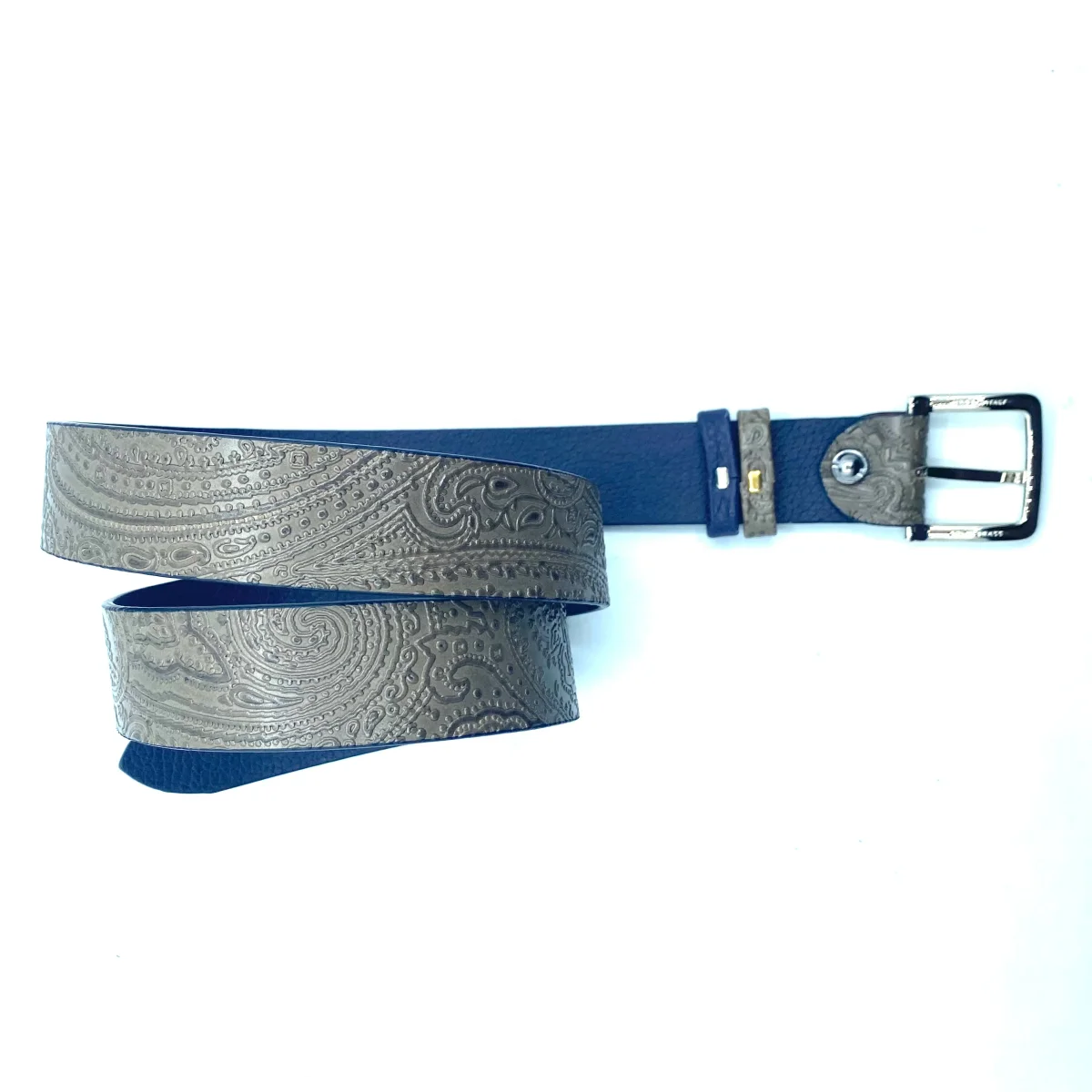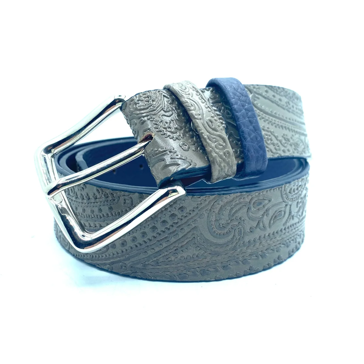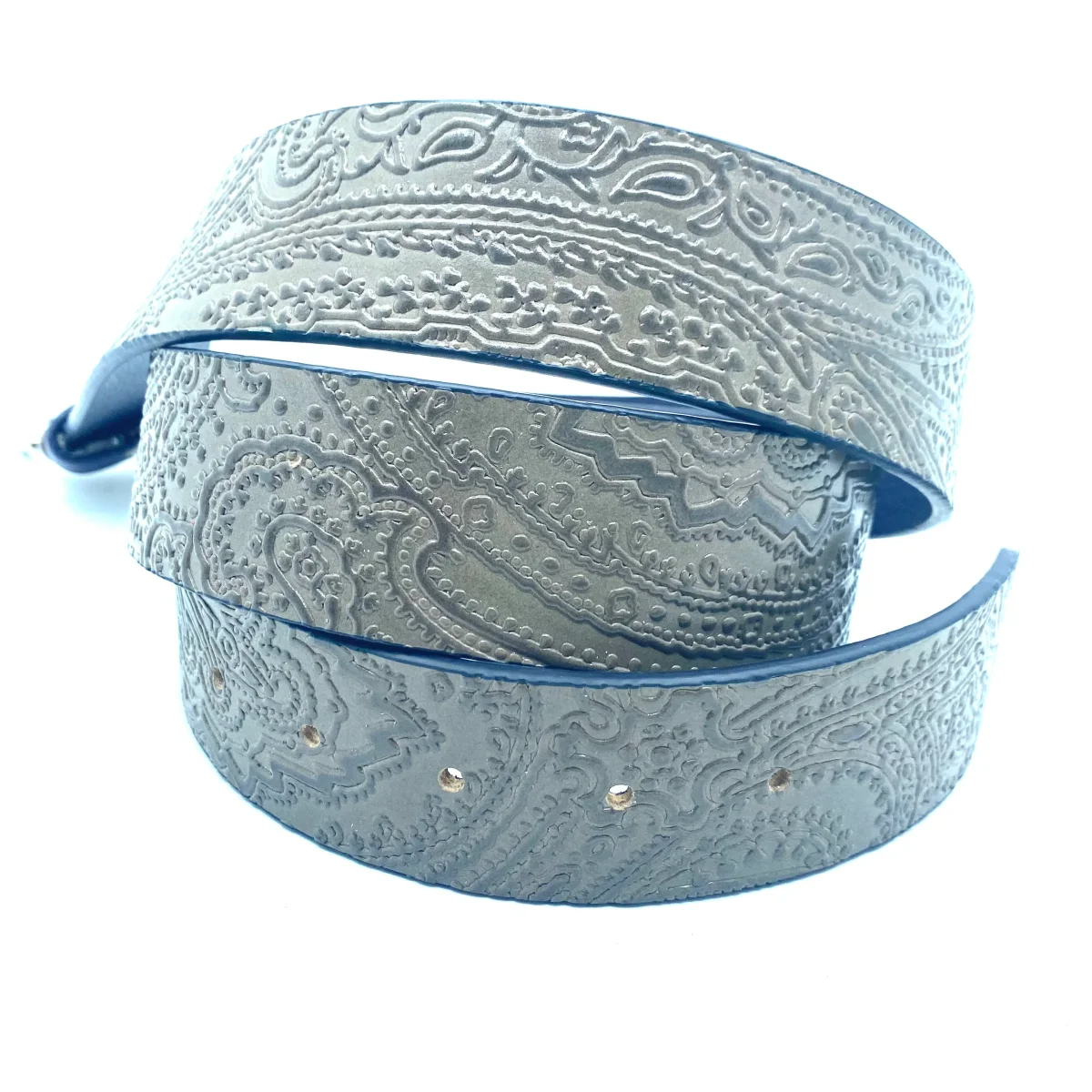 cintura artigianale reversibile unisex in vera pelle con stampa in bassorilievo grigia o viola. Fibbia in metallo Cintura accorciabile altezza 4 cm Taglia 115/130 Prodotto di qualità artigiana. Made in Italy