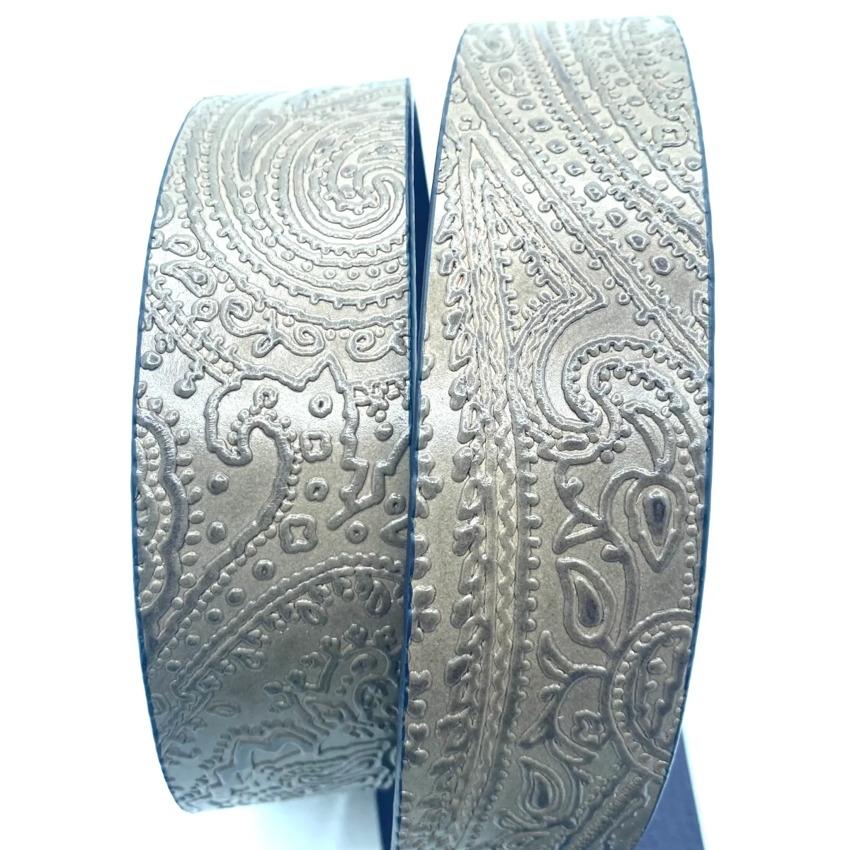 cintura artigianale reversibile unisex in vera pelle con stampa in bassorilievo grigia o viola. Fibbia in metallo