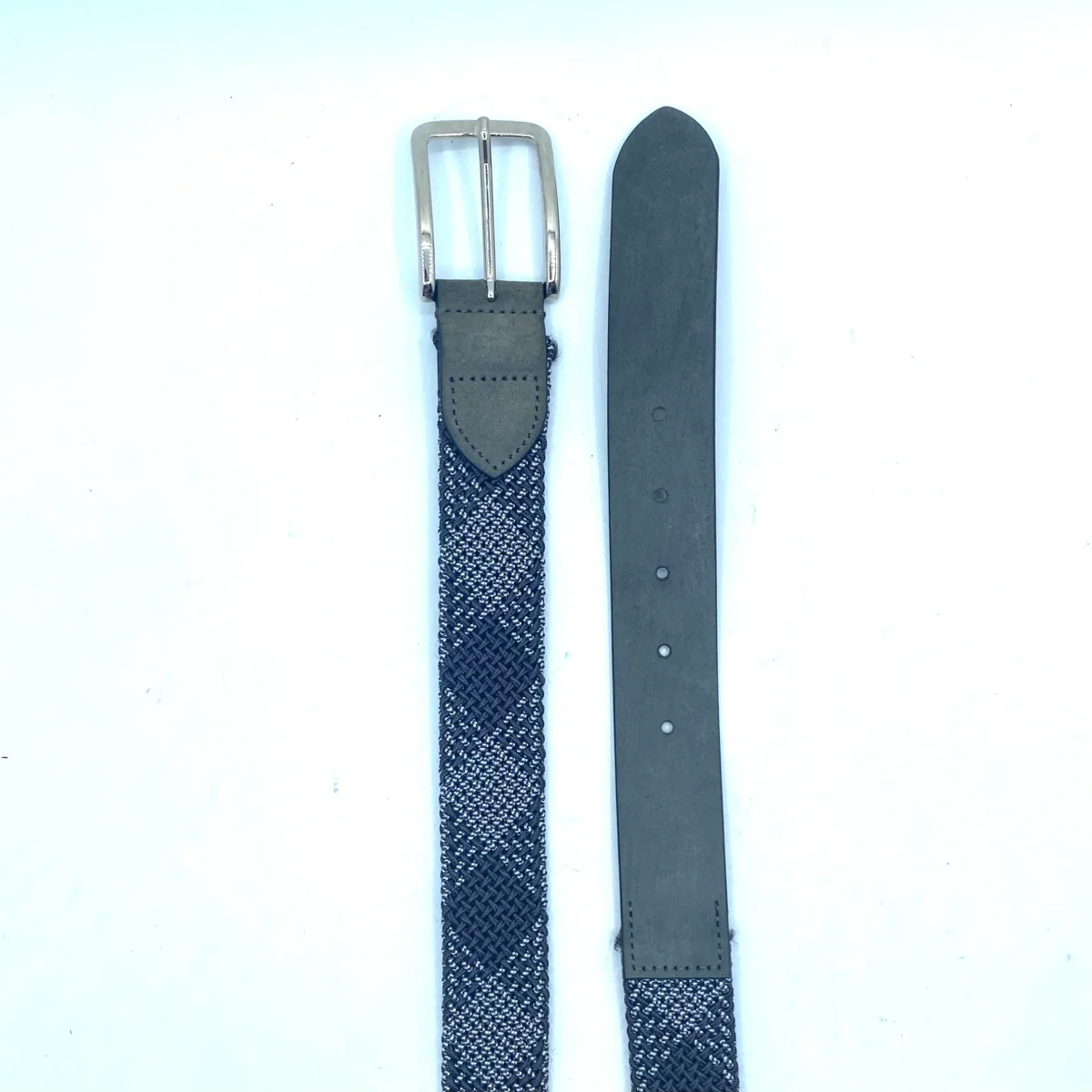 Bellissima cintura unisex intrecciata elasticizzata di colore marrone/bianco/grigio con estremità in vera pelle scamosciata grigia