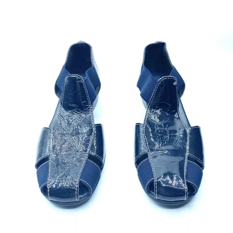 Mocassini per Donna Cinzia Soft realizzati in pelle vernice colore blu, morbidissimi, dotati di elastici laterali per favorire la calzata. Sfoderati all’interno, sottopiede in pelle blu, fondo in gomma con zeppa 4,5cm Numero 39 lunghezza interna 25,4 cm Primavera Estate Made in italy