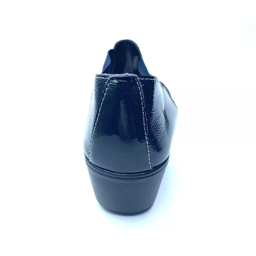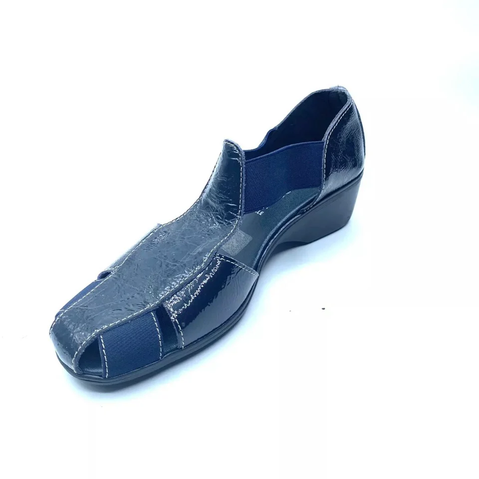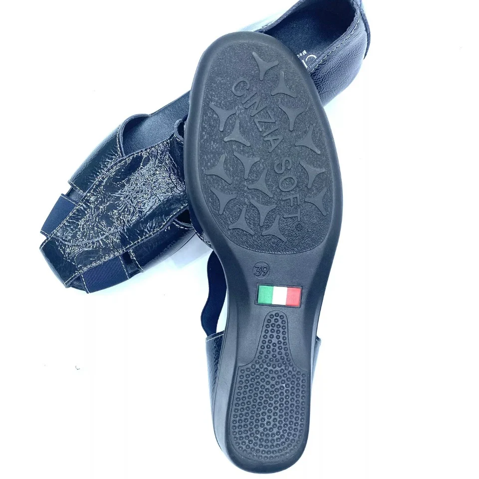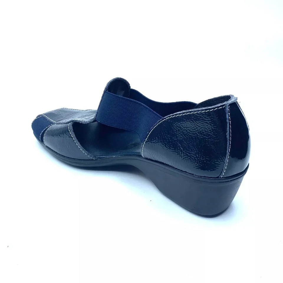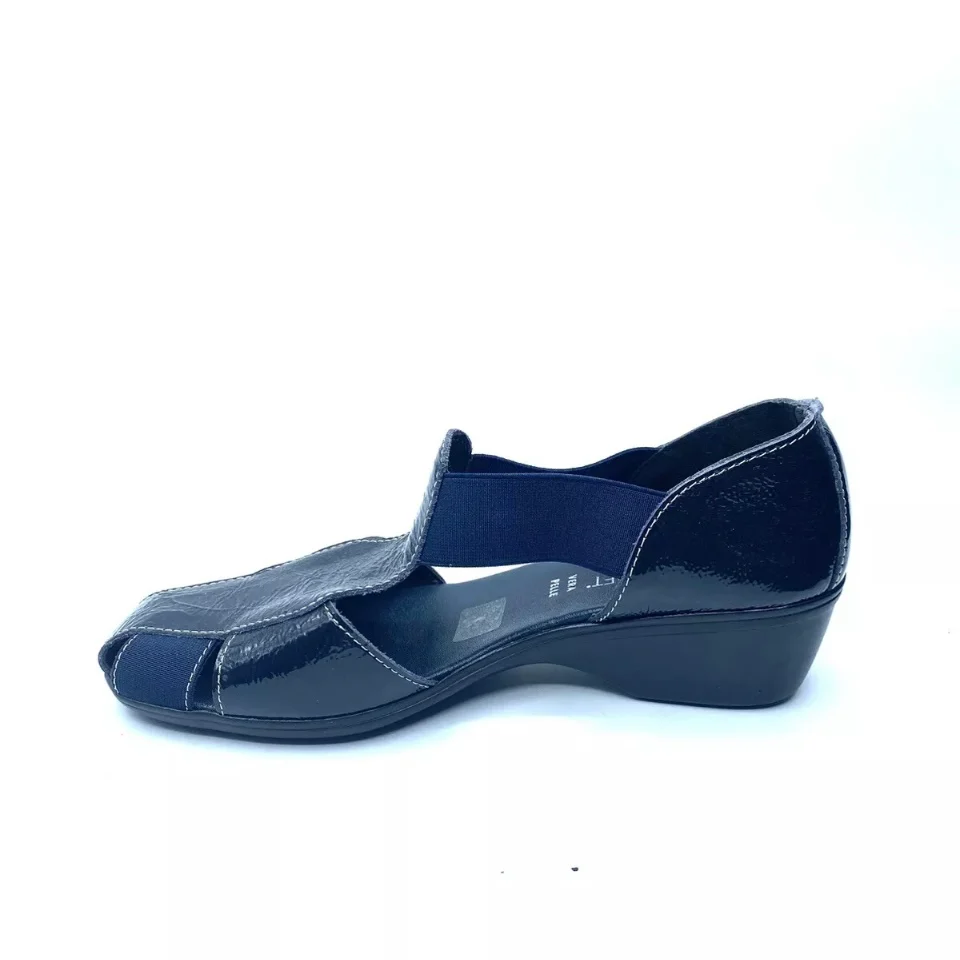 Mocassini per Donna Cinzia Soft realizzati in pelle vernice colore blu, morbidissimi, dotati di elastici laterali per favorire la calzata. Sfoderati all’interno, sottopiede in pelle blu, fondo in gomma con zeppa 4,5cm