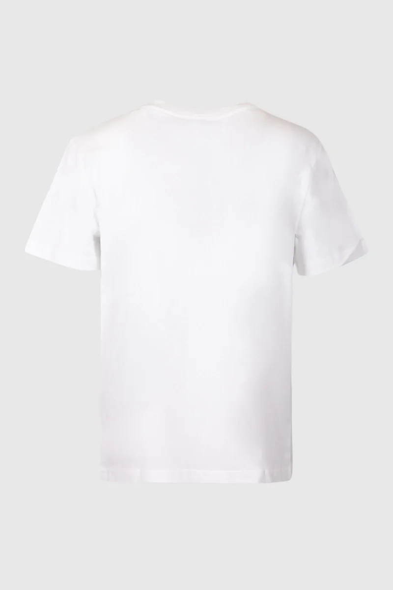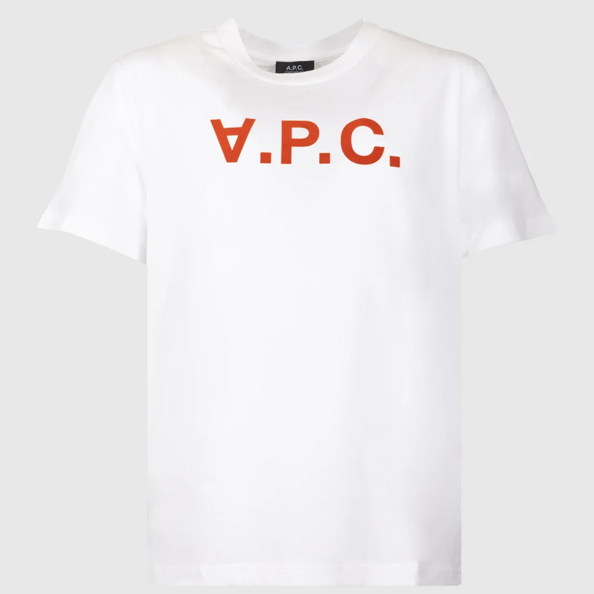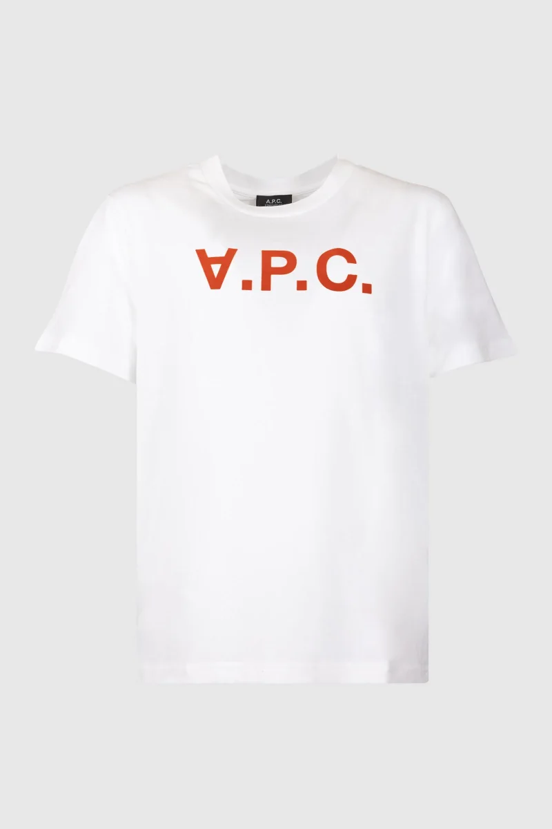 T-shirt A.P.C., maniche corte, girocollo, color bianco e logo rosso.
