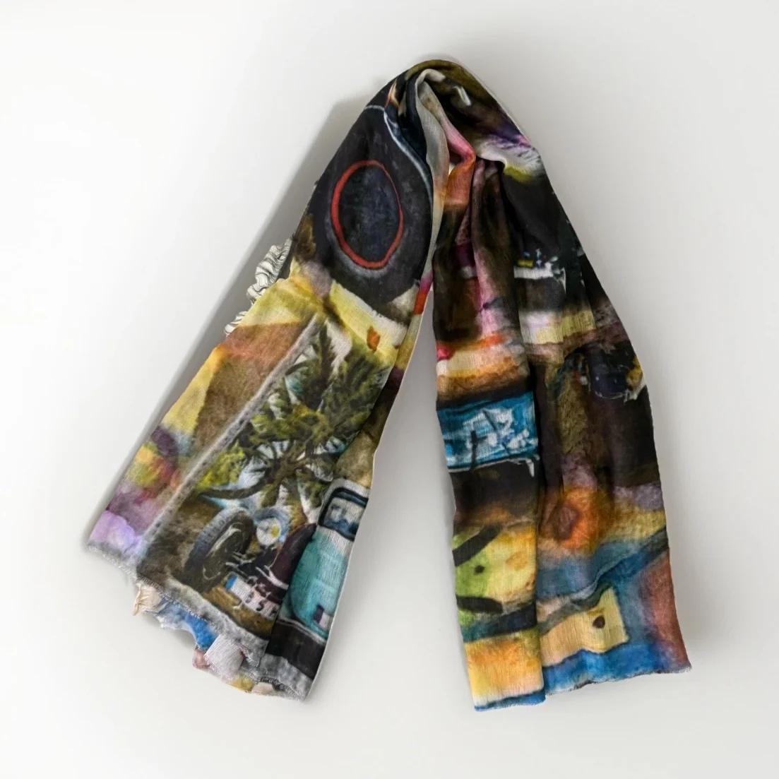 Maxi sciarpa decorativa artistica con una stampa a tema automobilistico vintage. Presenta una vivace composizione artistica che raffigura diverse auto d’epoca e classiche. Il design include modelli iconici come una Citroën 2CV, vari modelli sportivi d’epoca e persino un trattore. La stampa è caratterizzata da colori caldi e uno stile astratto sullo sfondo, alternato a […]