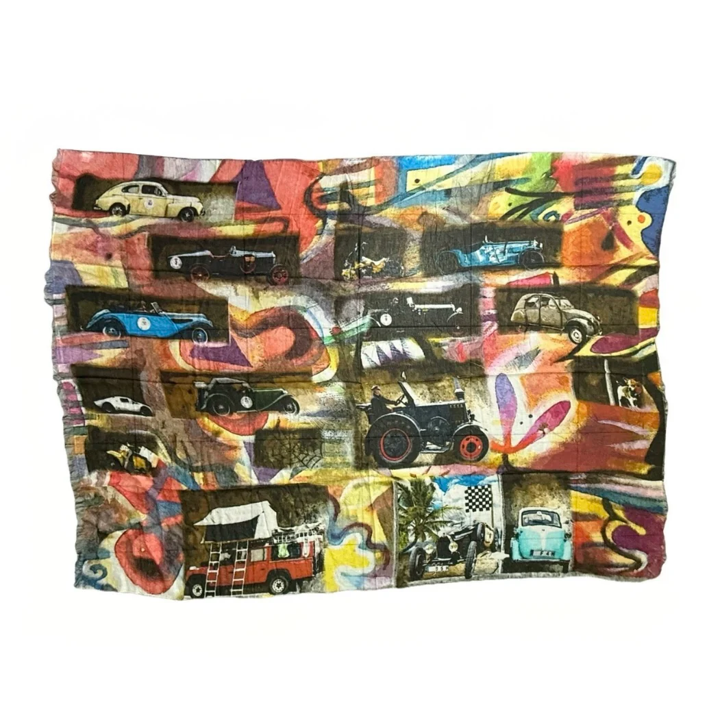 Maxi sciarpa decorativa artistica con una stampa a tema automobilistico vintage.