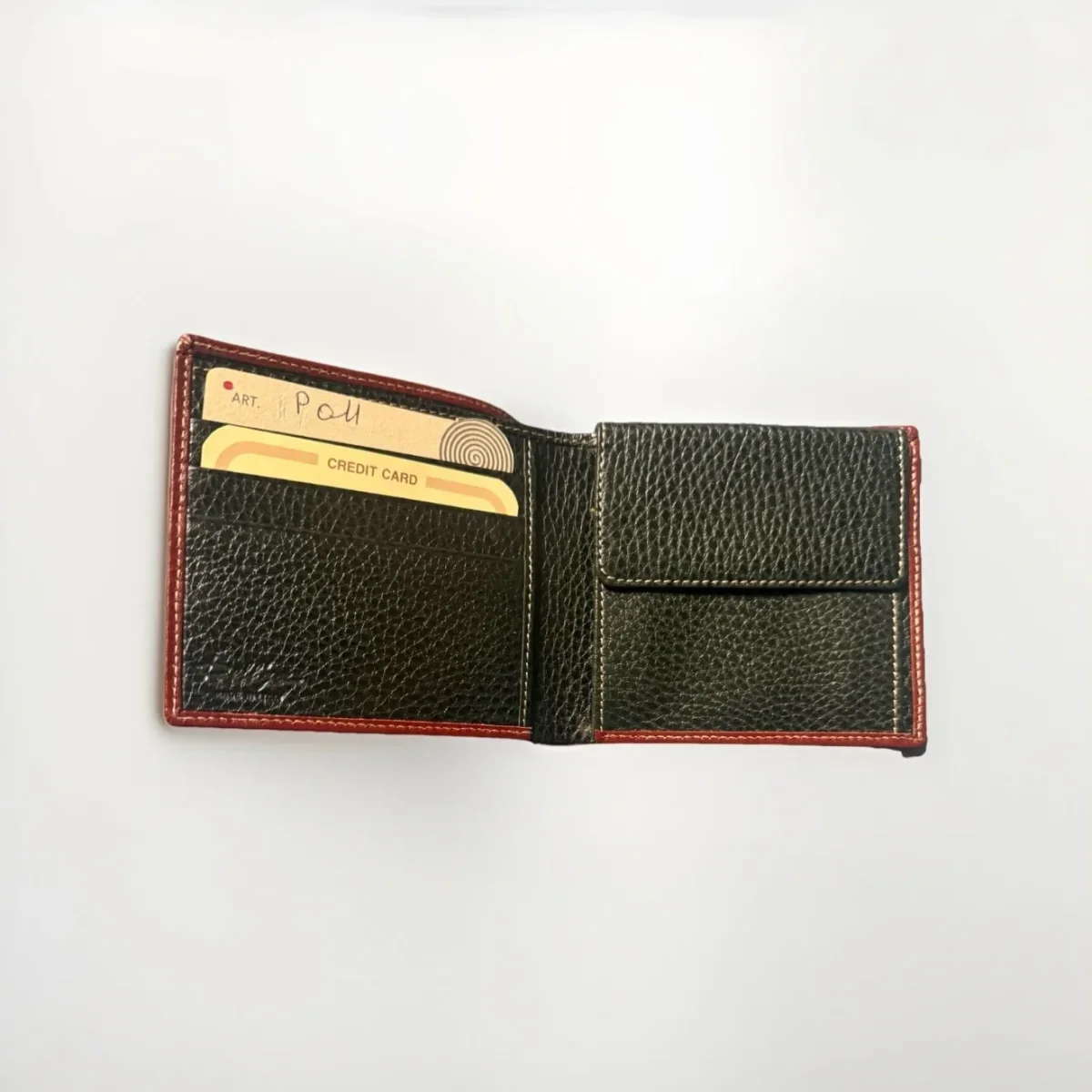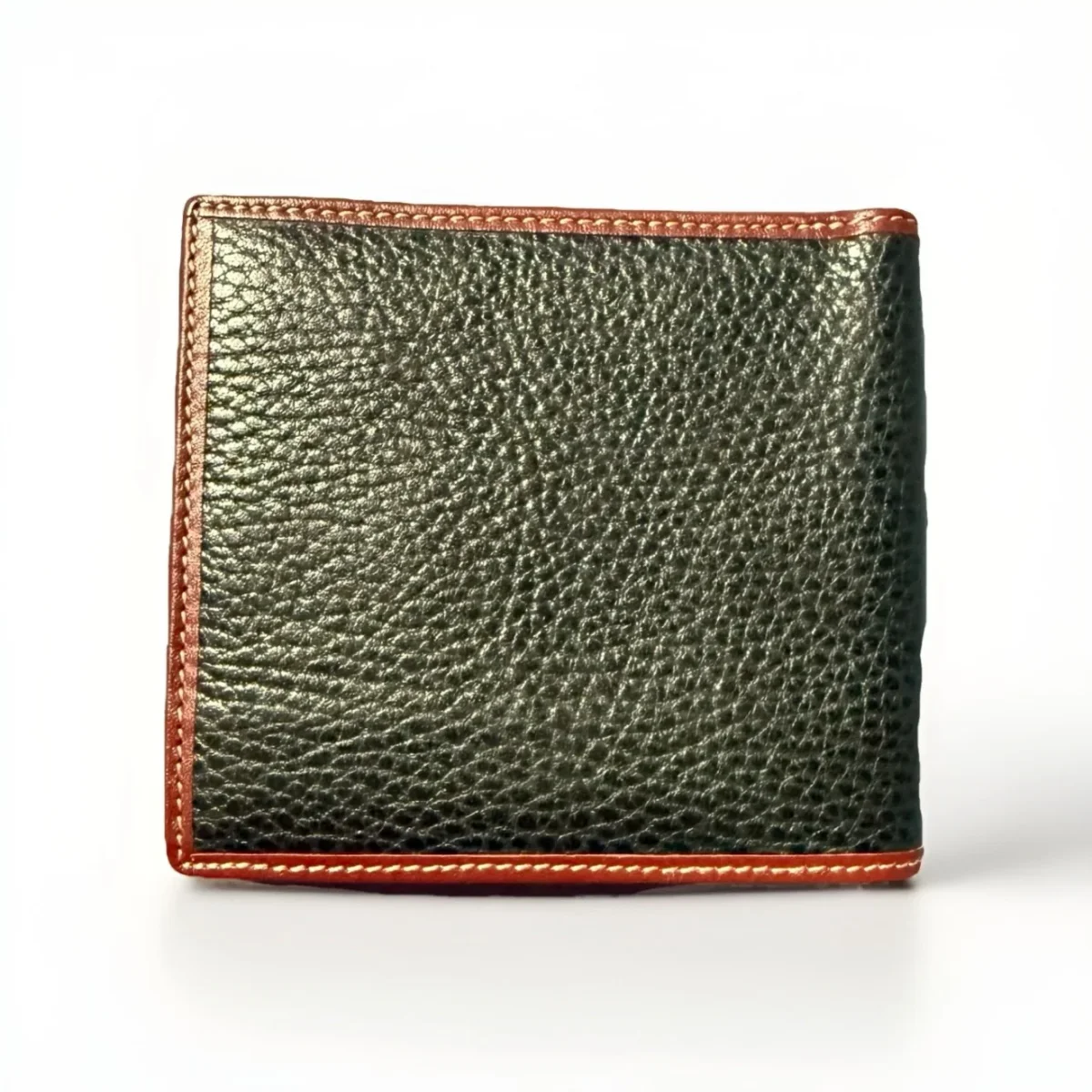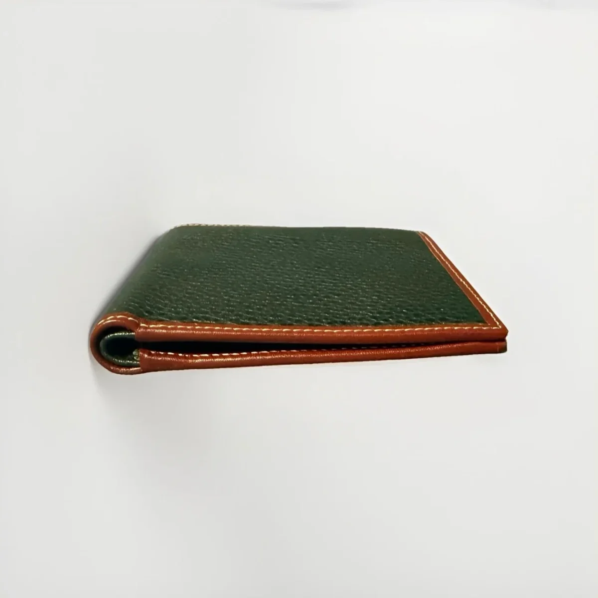 Portafoglio bi-fold in pelle martellata verde con bordi in pelle marrone e cuciture bianche realizzata dall’azienda Dell’Ga eccellenza Made in Italy