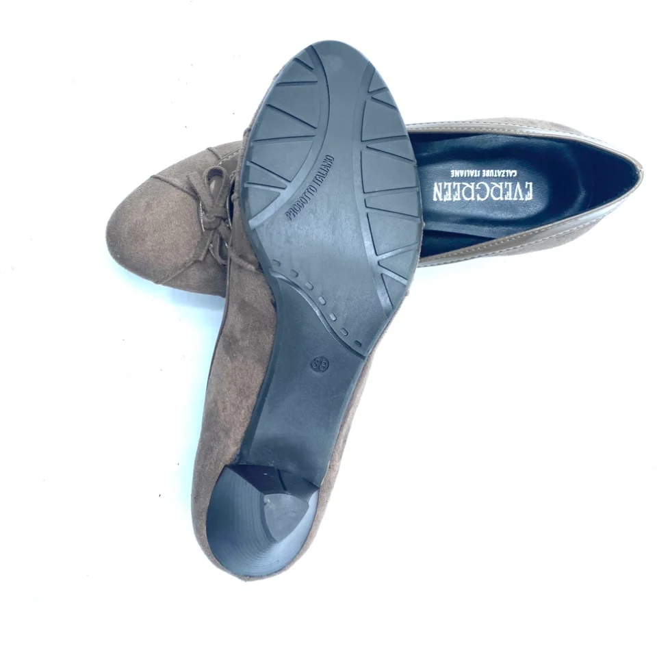 Scarpa EVERGREEN numero 38, in vera pelle scamosciata con bordo in vernice di colore taupè con fondo in gomma antiscivolo.