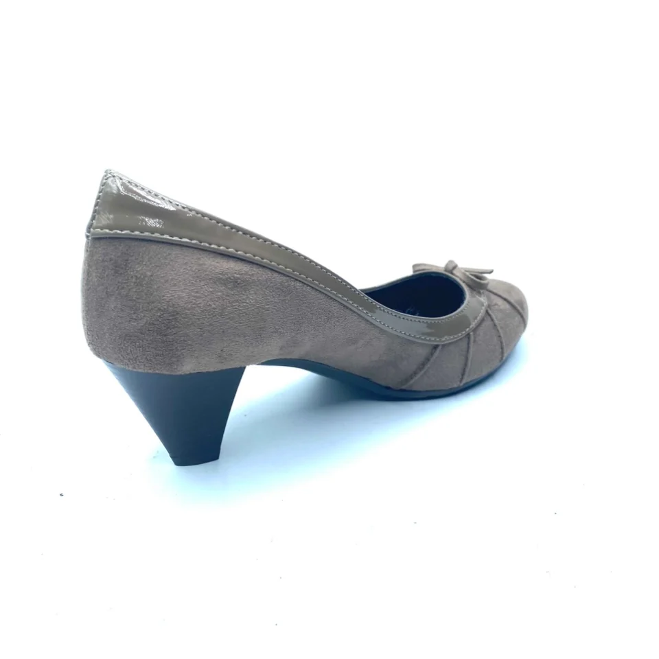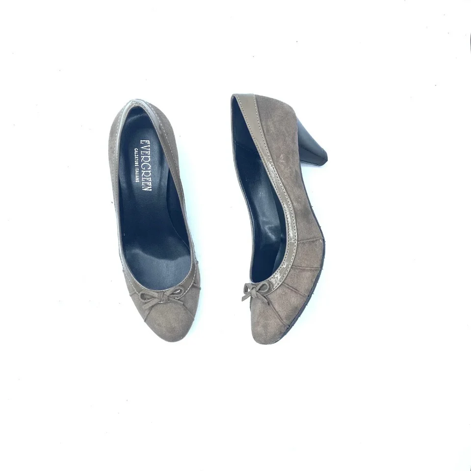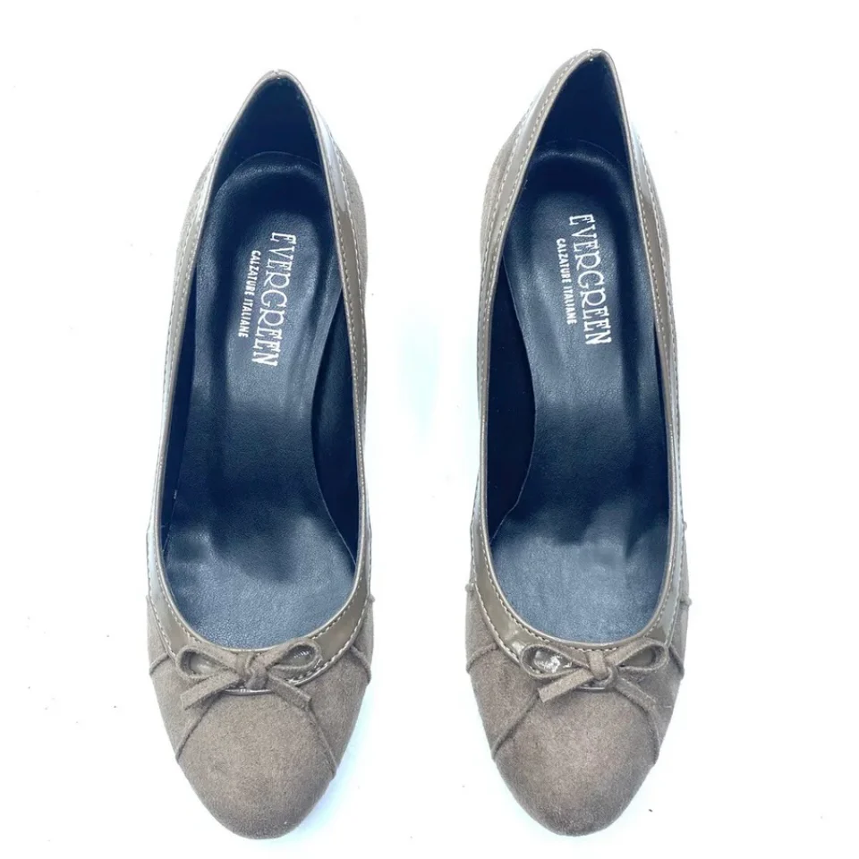 Scarpa EVERGREEN numero 38, in vera pelle scamosciata con bordo in vernice di colore taupè con fondo in gomma antiscivolo. Tacco 5 cm, soletta in pelle, fodera interna in pelle. Scarpe comfort Made in italy