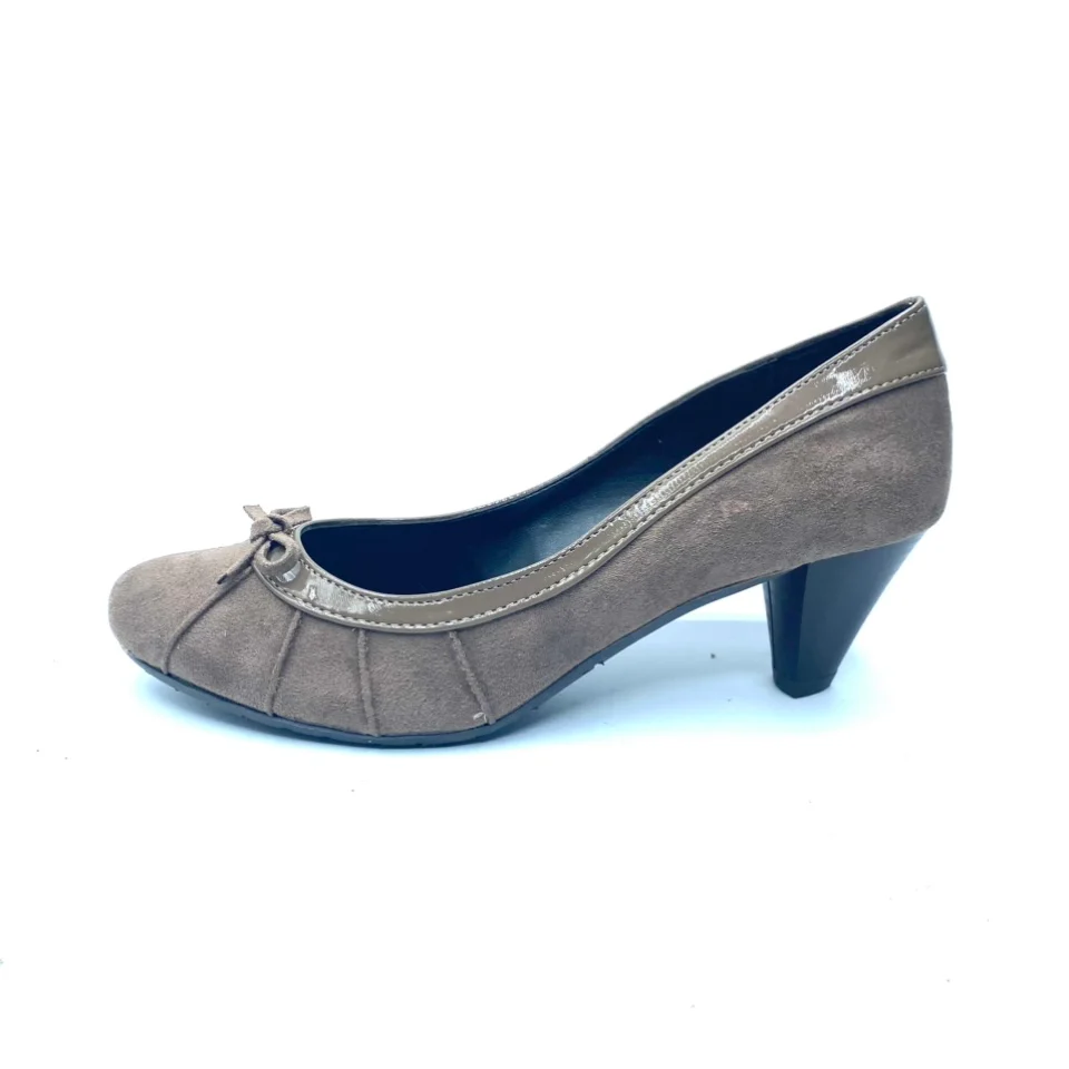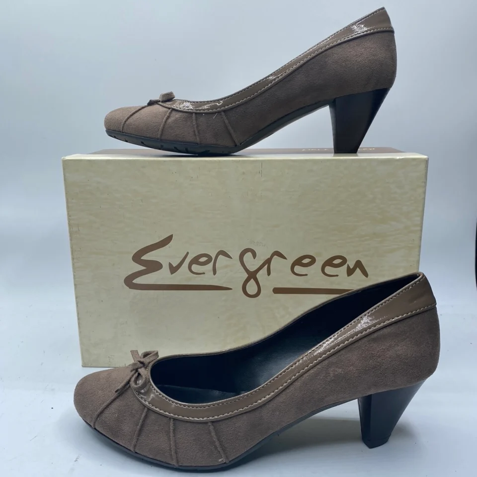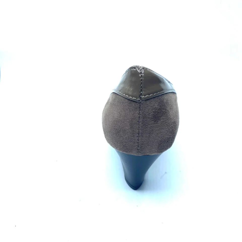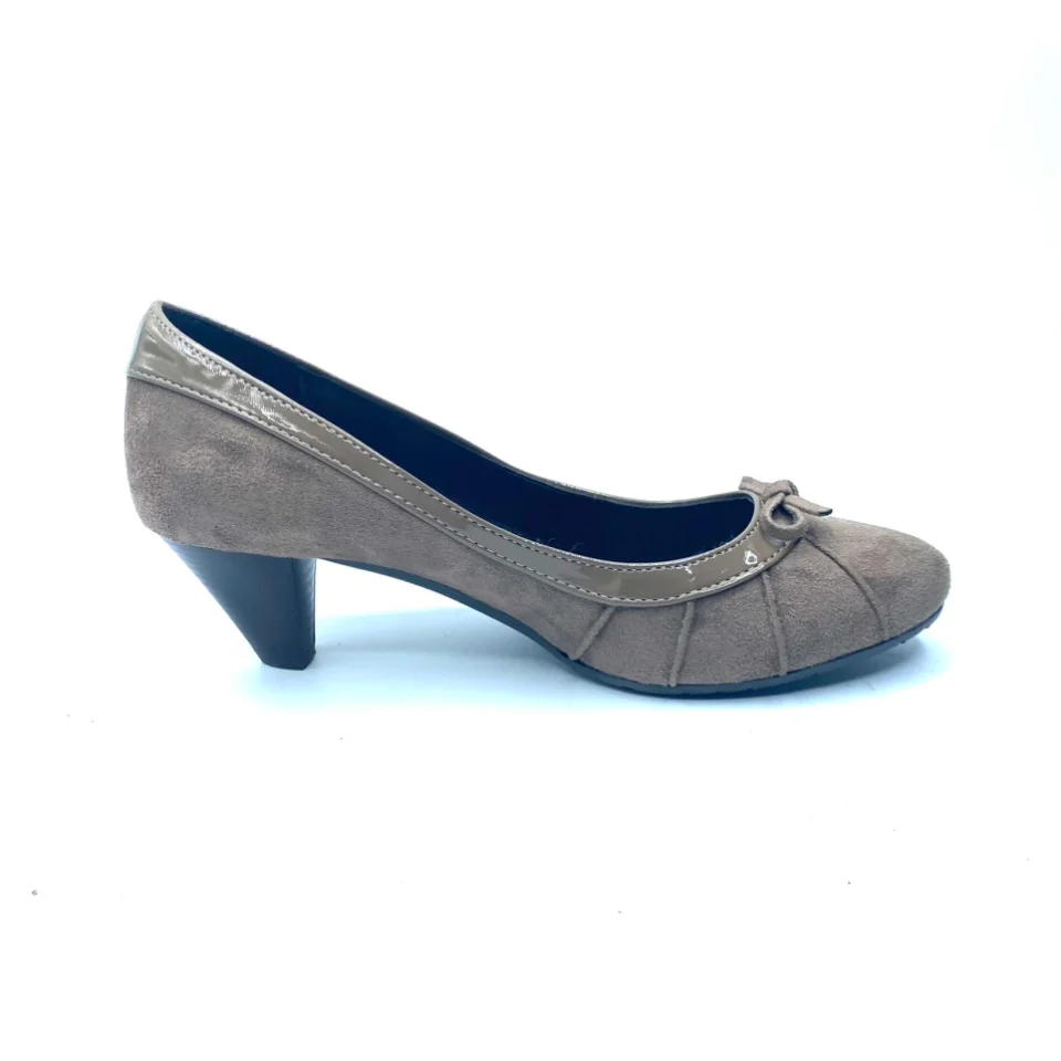 Scarpa EVERGREEN numero 38, in vera pelle scamosciata con bordo in vernice di colore taupè con fondo in gomma antiscivolo. Tacco 5 cm, soletta in pelle, fodera interna in pelle. Scarpe comfort Made in italy