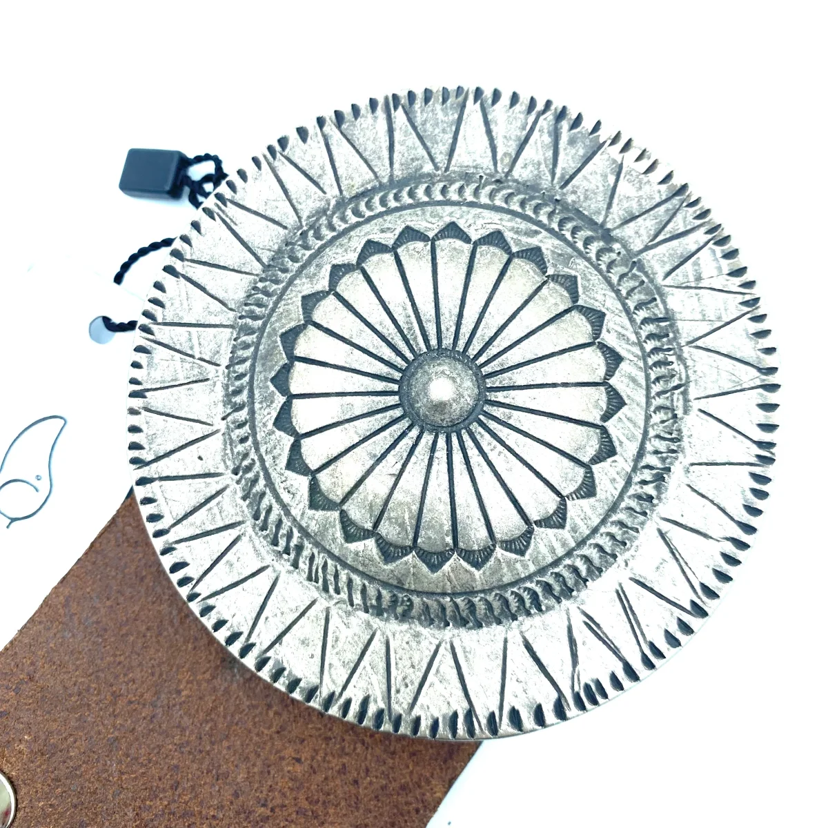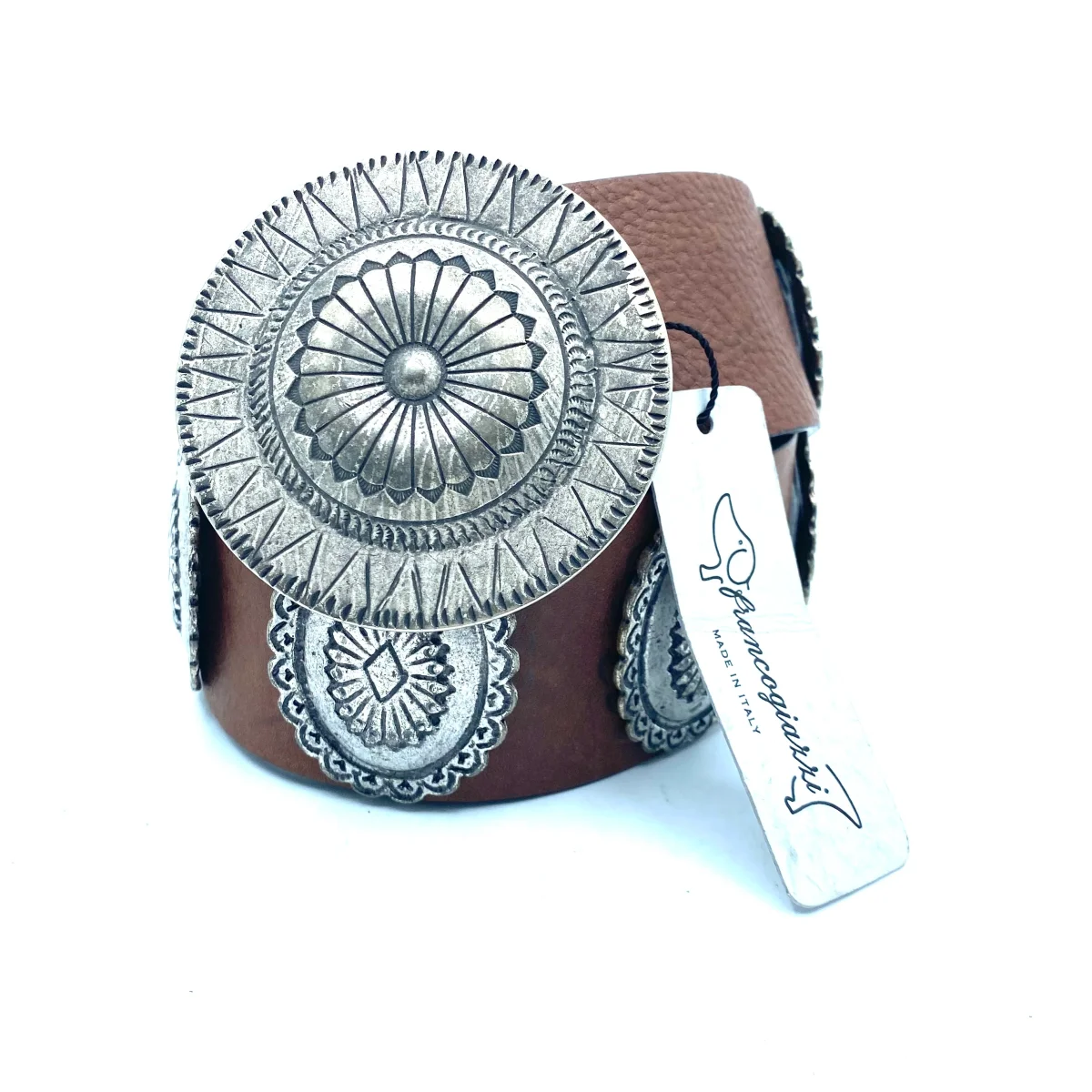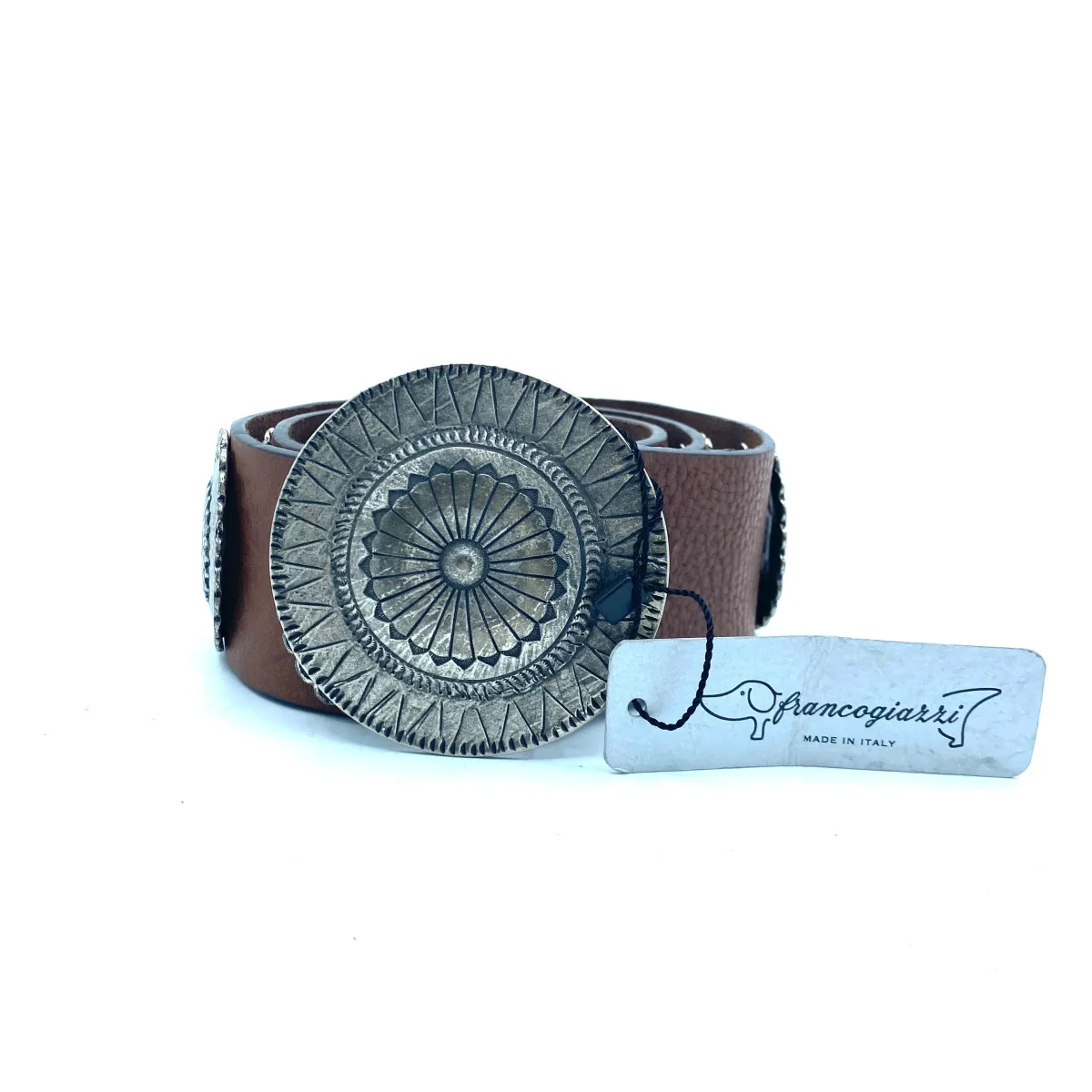 Cintura originale da donna Franco Giazzi con fibbia gioiello in metallo e applicazioni su tutta la cintura Colore marrone. 100% vera pelle. Un accessorio elegante per un look formale ma anche casual. Taglia 100 Altezza 6 cm Made in ITALY