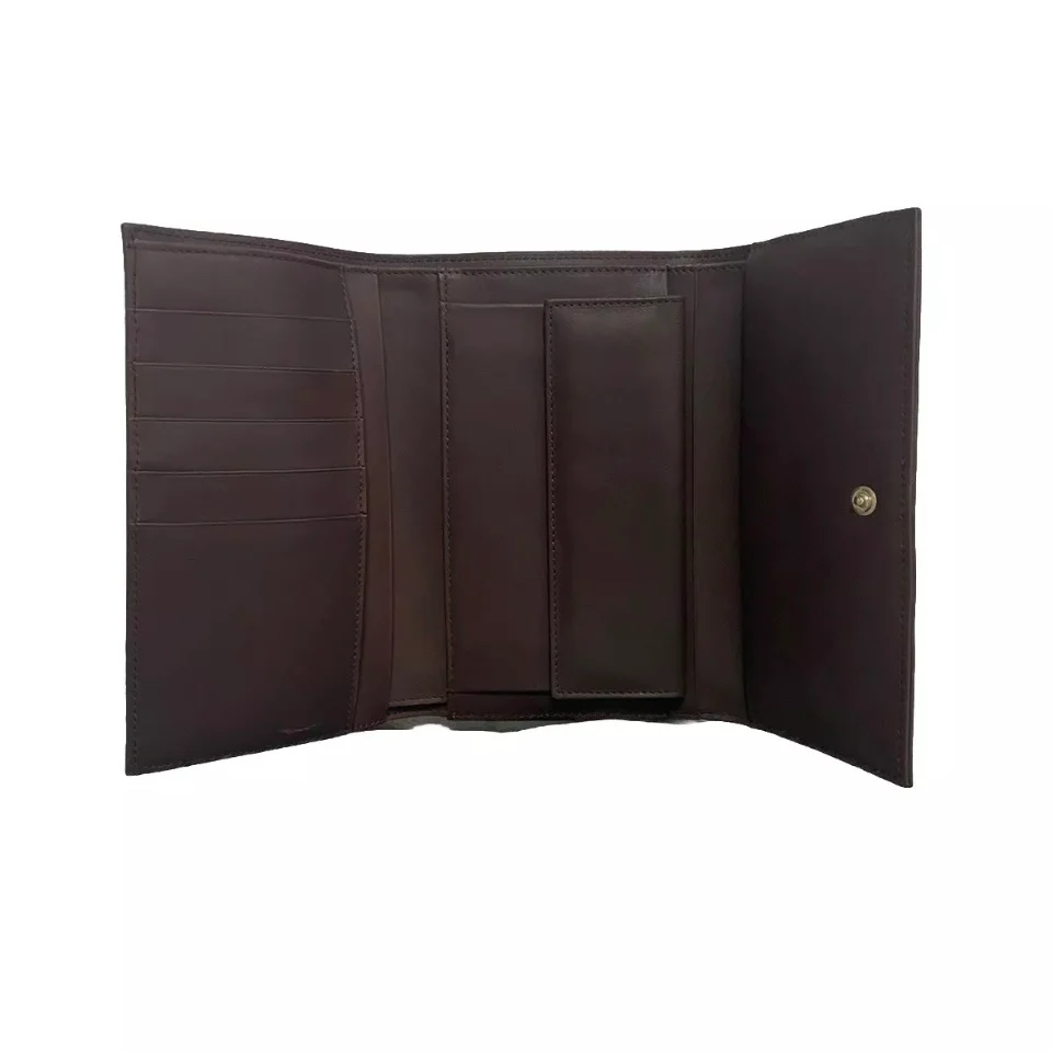 Portafoglio donna marrone/marrone scuto in vera pelle con logo GHERARDINI in metallo chiuso con bottone a pressione 5 slot Porta carte di credito,/porta tessere 5 tasche porta documenti Tasca centrale portabanconote Portamene chiuso con bottone a pressione 100%pelle Misure 16 x 10 x 3 cm Made in Italy