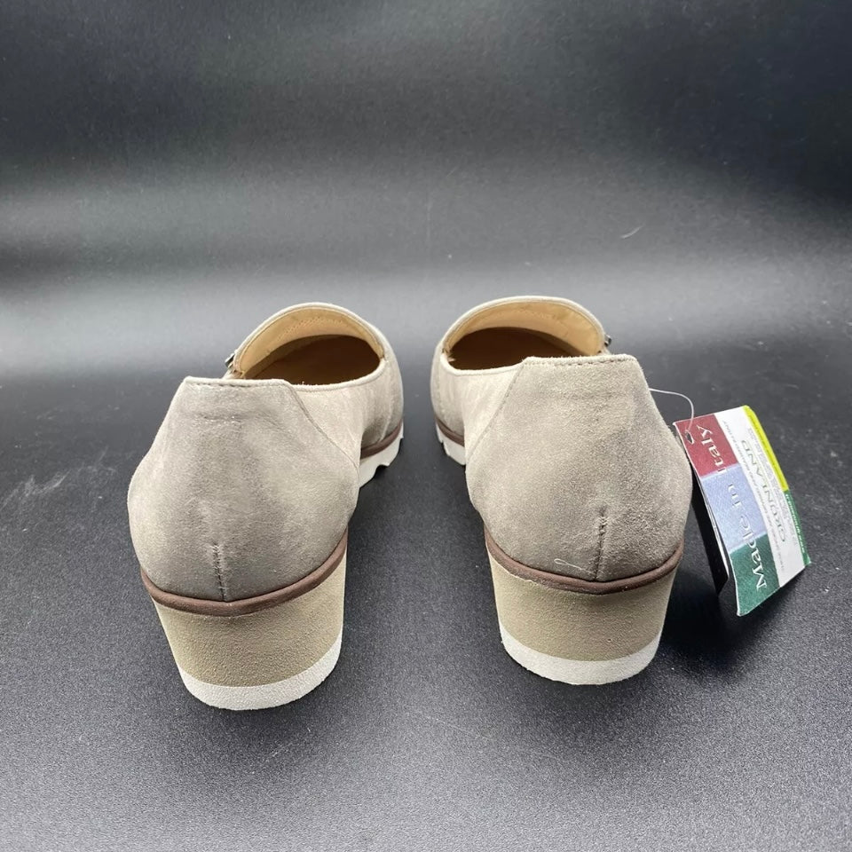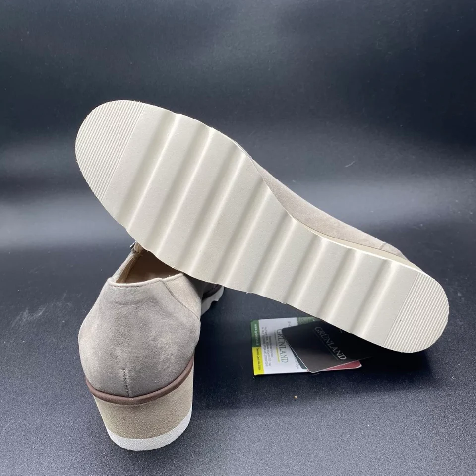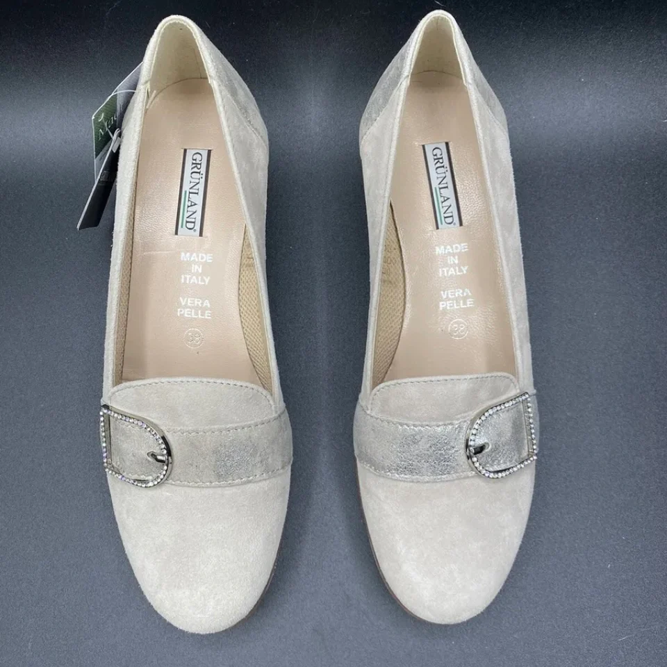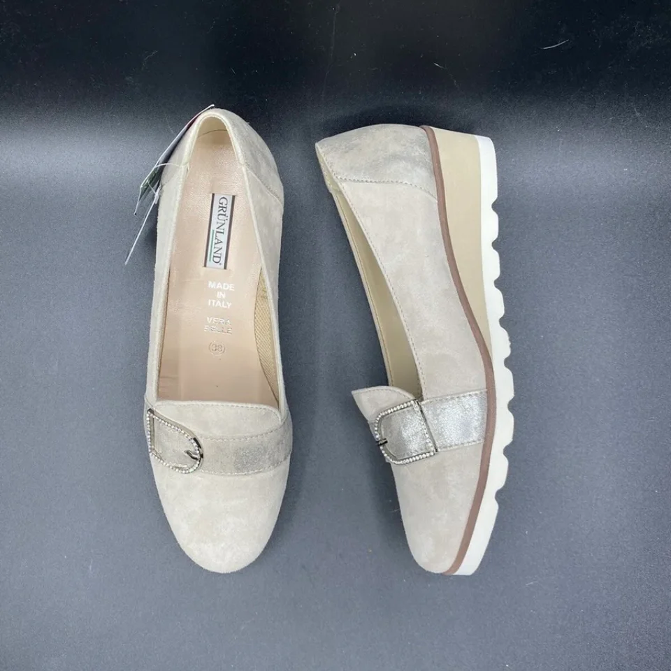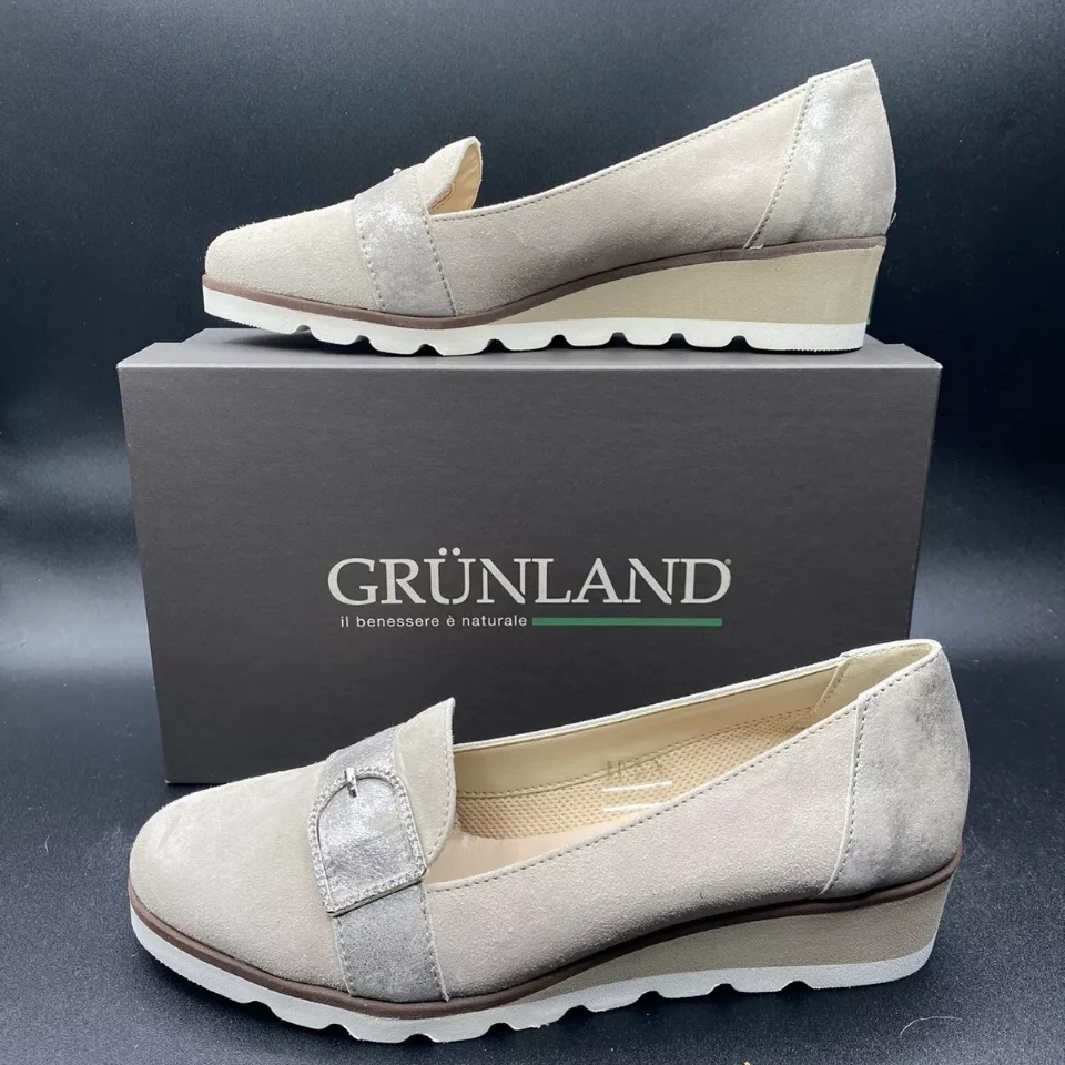 Mocassini GRUNLAND Made in Italia con materiali di alta qualità. In vera pelle scamosciata con fantasia fibbia con strass di colore beige. Stagione primavera estate fondo in gomma. Design italiano, materiali naturali. Forma anatomica e massimo comfort. Leggerissimi. Con zeppa di 3,5 cm Senza tacco Numero 38 – Lunghezza interna 25 cm Numero 40 lunghezza […]
