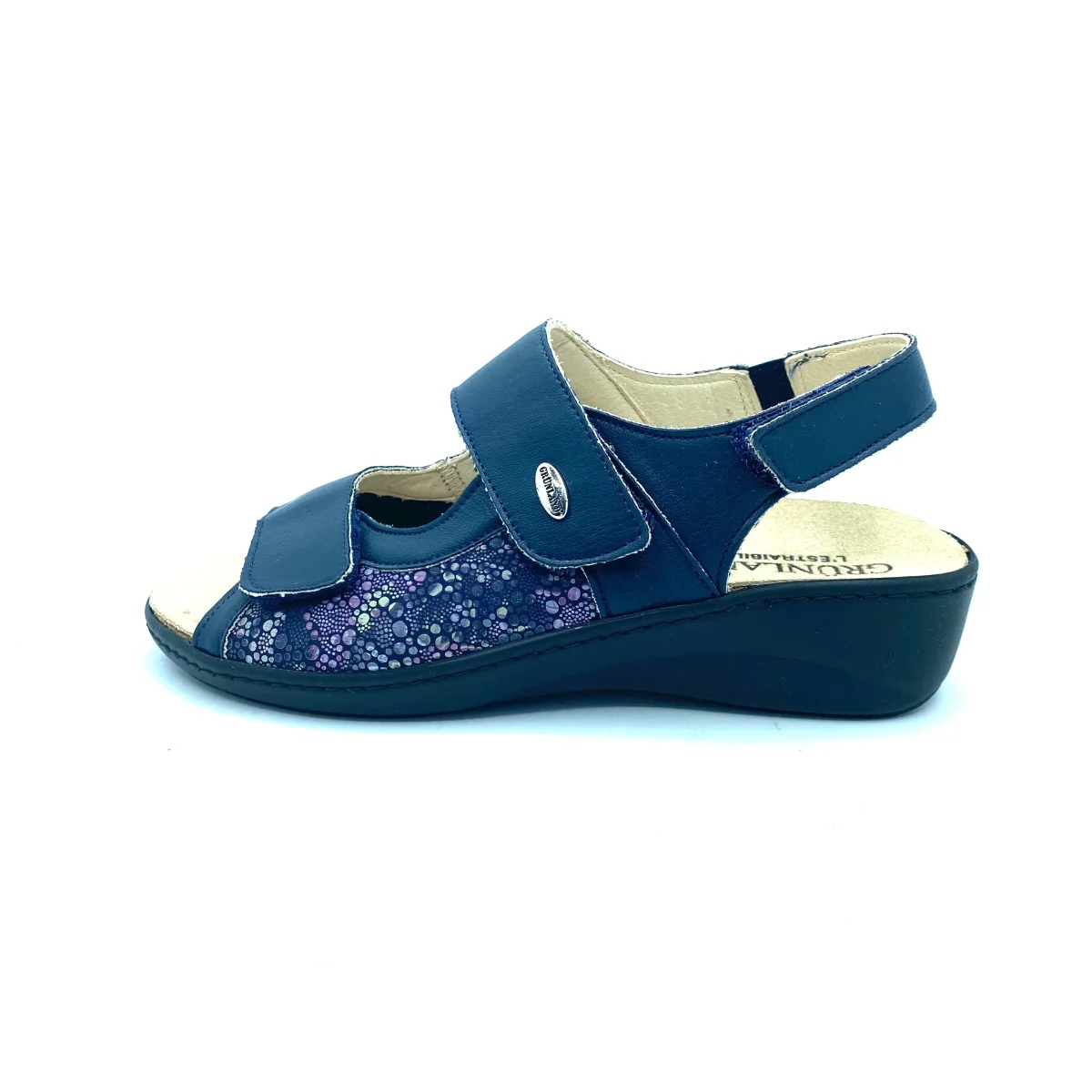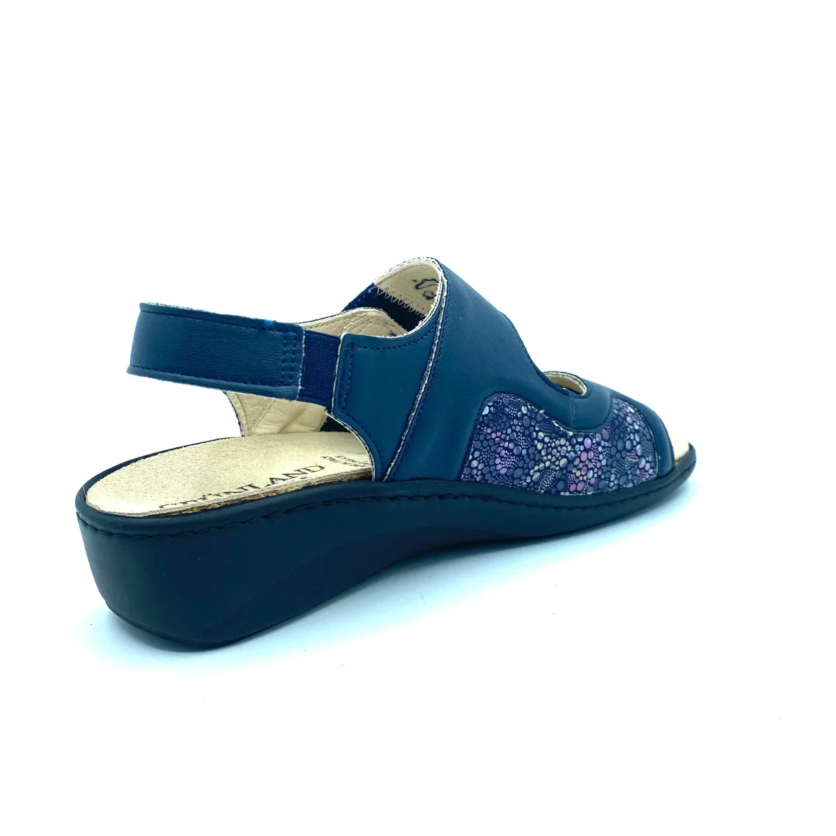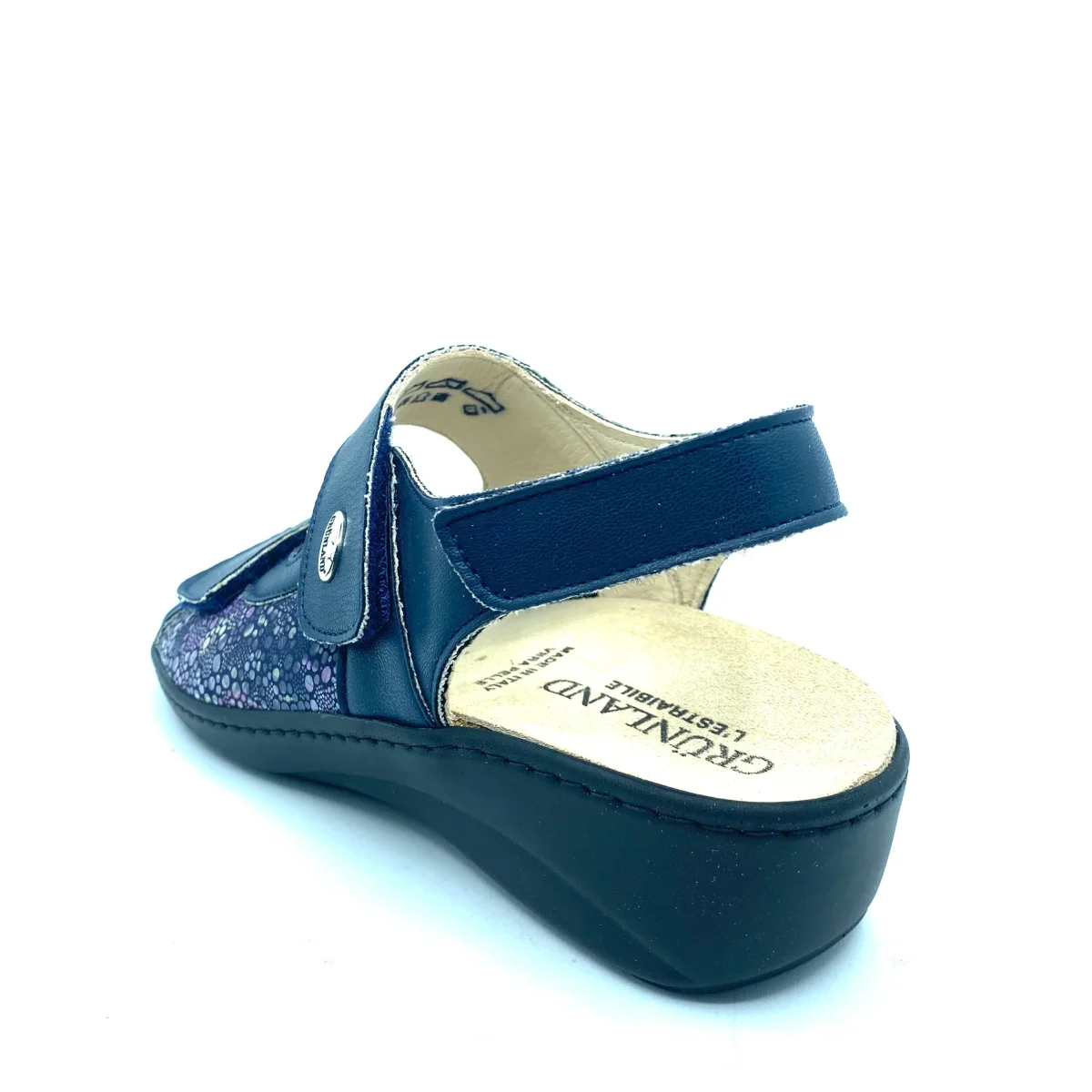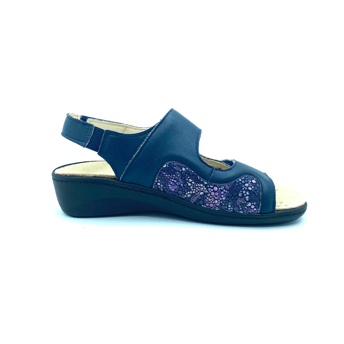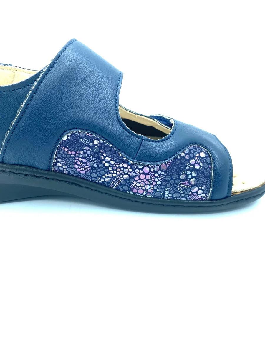 Sandalo blu con inserti in stampa maculata. Doppia fascia su collo del piede con strappo velcro e laccetto su caviglia con cinturino a strappo regolabile. Sottopiede estraibile realizzato con una mescola di lattice e sughero in grado di ammortizzare l’impatto con il terreno. Zeppa 4 cm con battuta 1,5 cm. Tomaia in pelle ed ecopelle, interno in pelle e suola in gomma.