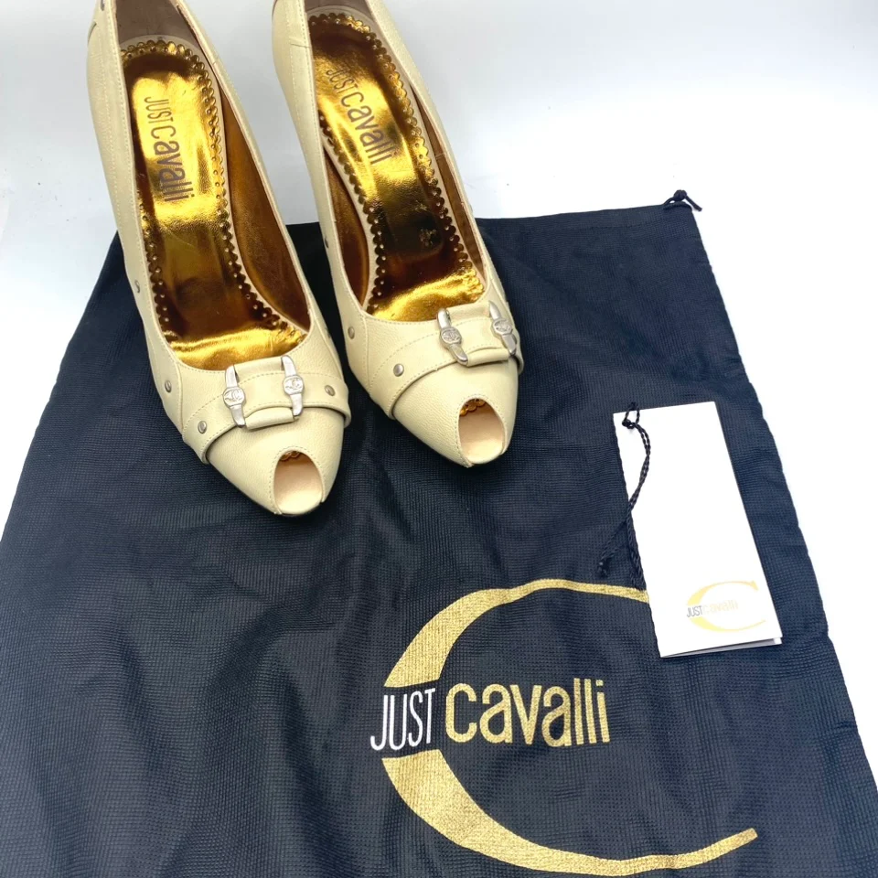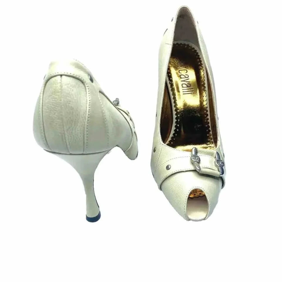 Just Cavalli Décolleté da donna molto fine ed elegante, modello aperto in punta, dall’ottima calzata e qualità. Vera pelle con fibbia logata Just Cavalli. originali di colore bianco panna numero 40 Altezza tacco 10 cm Suola in cuoio Soletta interna in pelle Nuovo con scatola e dust bag originale Eccellenza del made in Italy