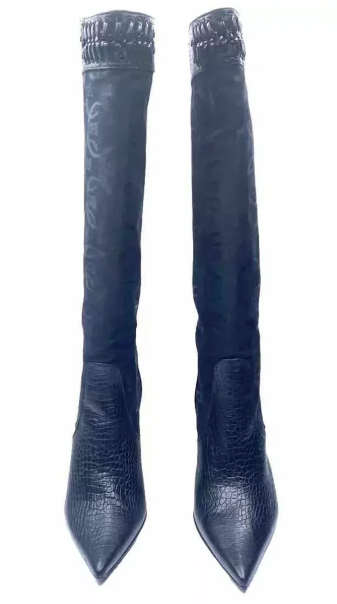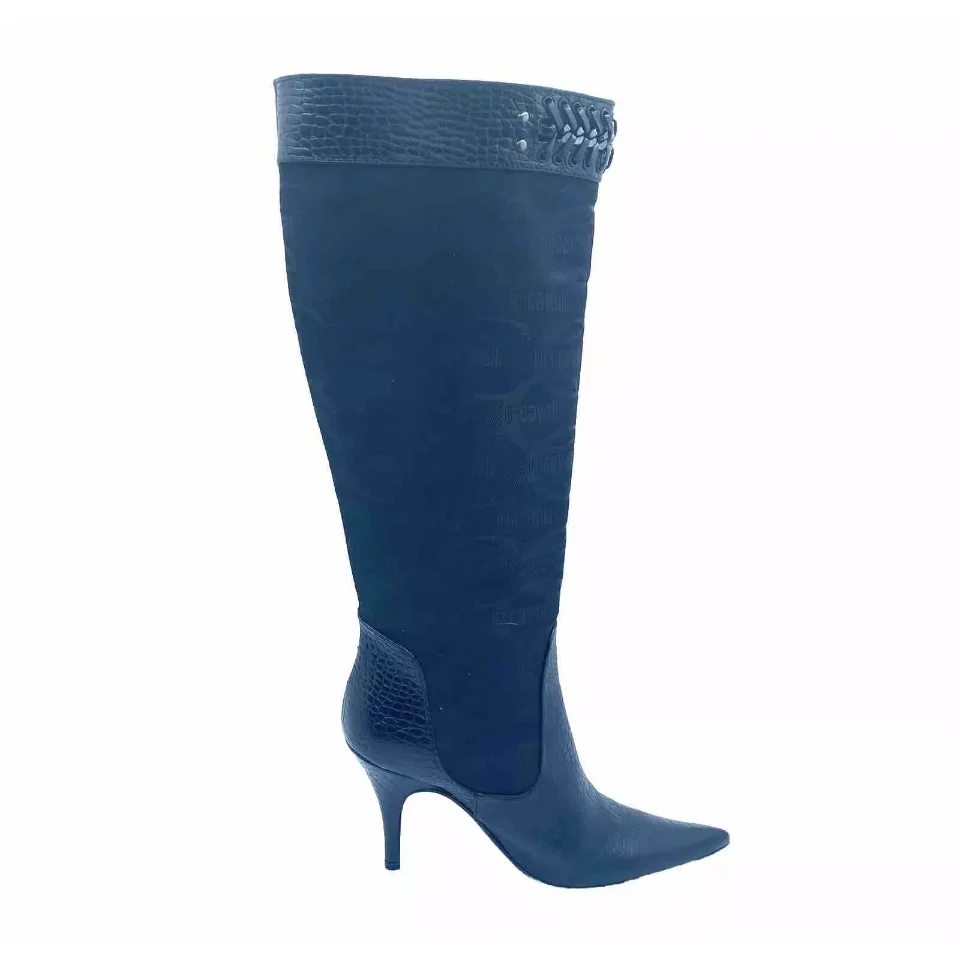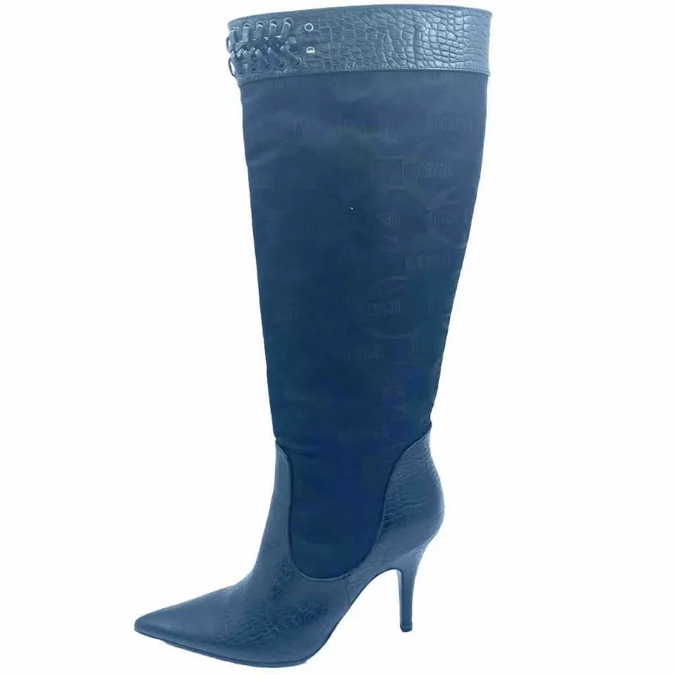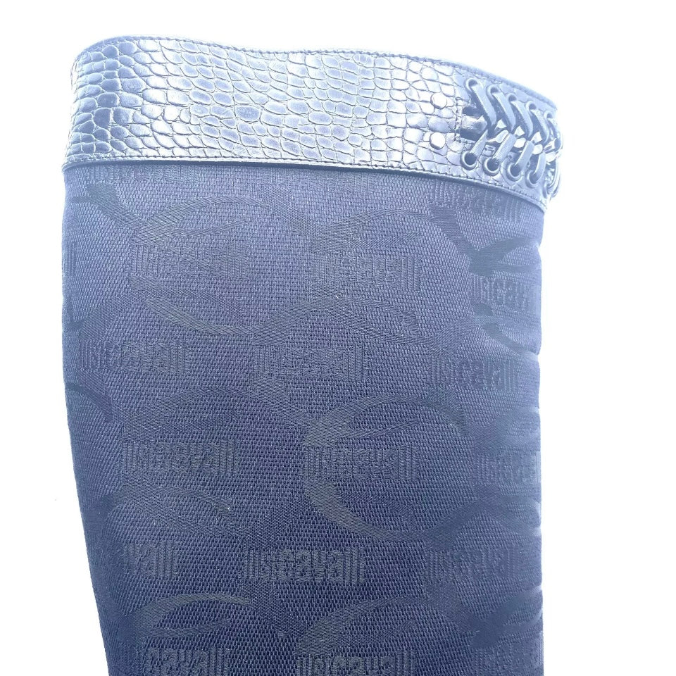 Bellissimi stivali alti Just Cavalli in vera pelle stampa coccodrillo e tessuto con stampa logata Just Cavalli. Stivali originali di colore nero numero 36, altezza tacco 9 cm
