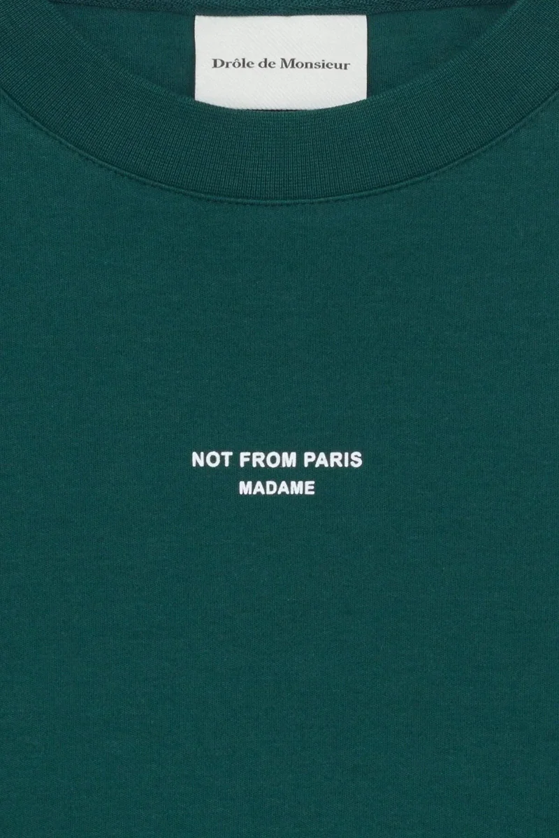 Questa t-shirt verde scuro in 100% cotone interlock con scollo a costine è stampata con lo slogan “Not from Paris Madame”.