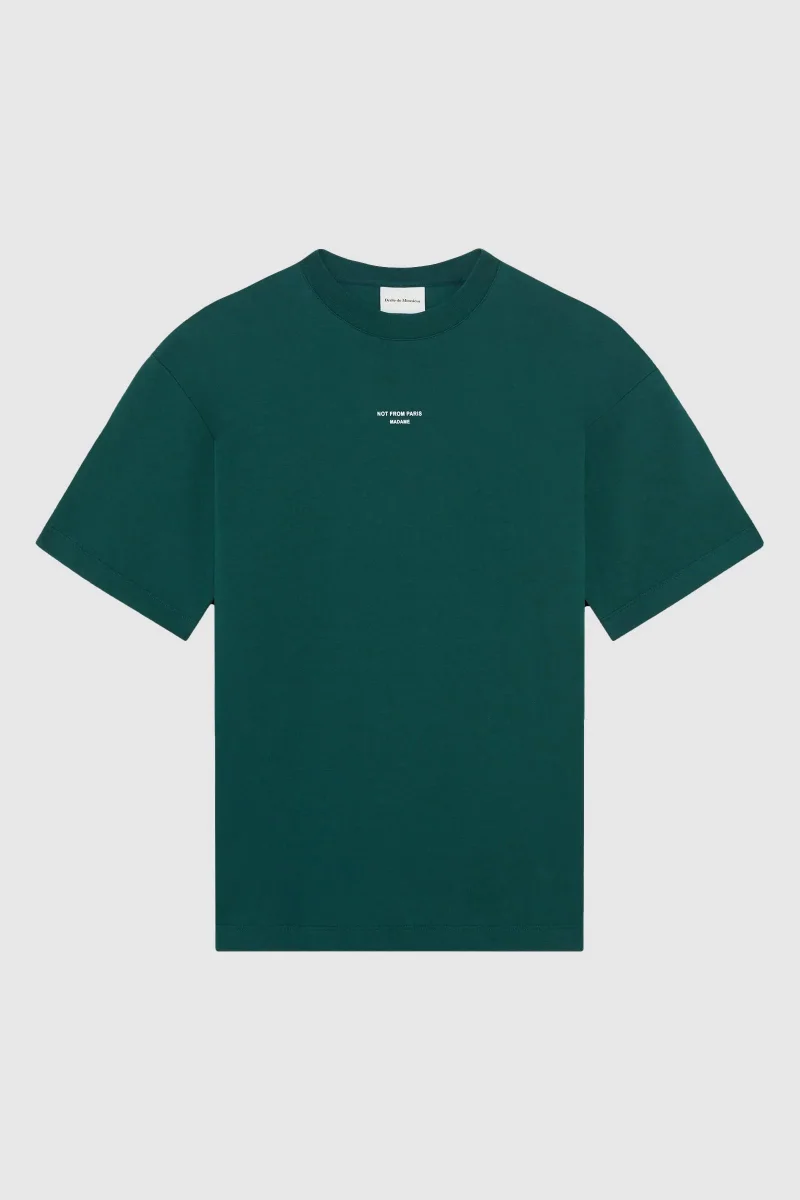 Questa t-shirt verde scuro in 100% cotone interlock con scollo a costine è stampata con lo slogan “Not from Paris Madame”.• Stampa frontale con slogan• Tessuto interlock• Scollo a costine• 100% cotone – 240 g/m²Colore: Verde scuro