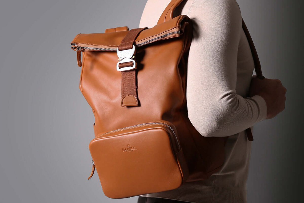 • Leather Roll Top Backpack with Modular Front Inserts.