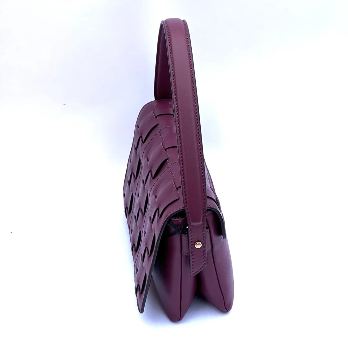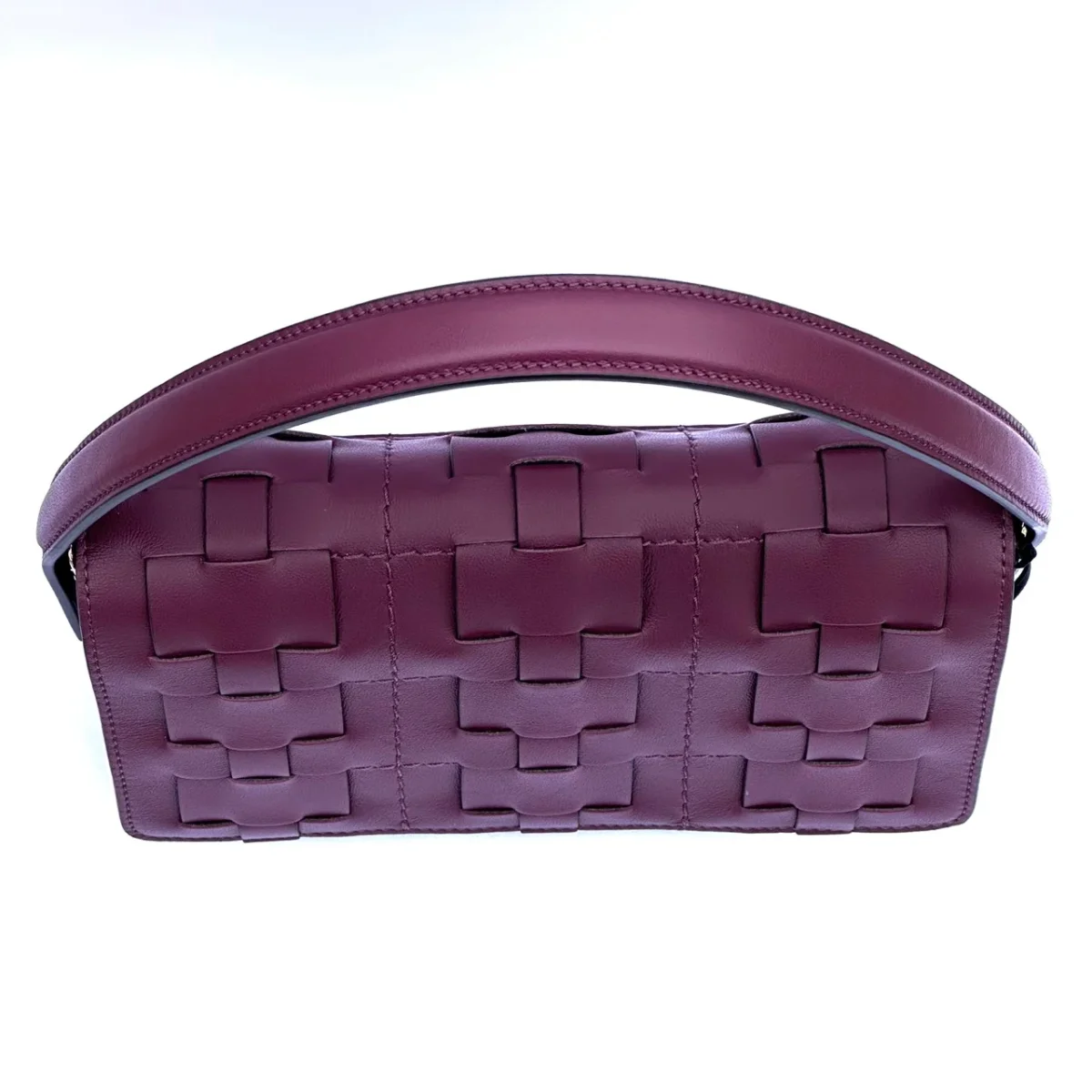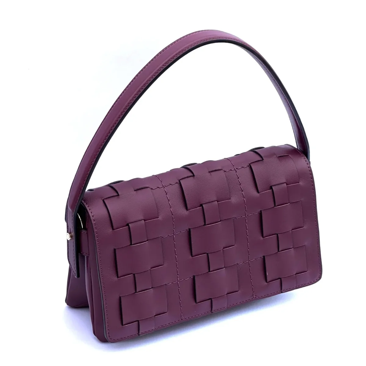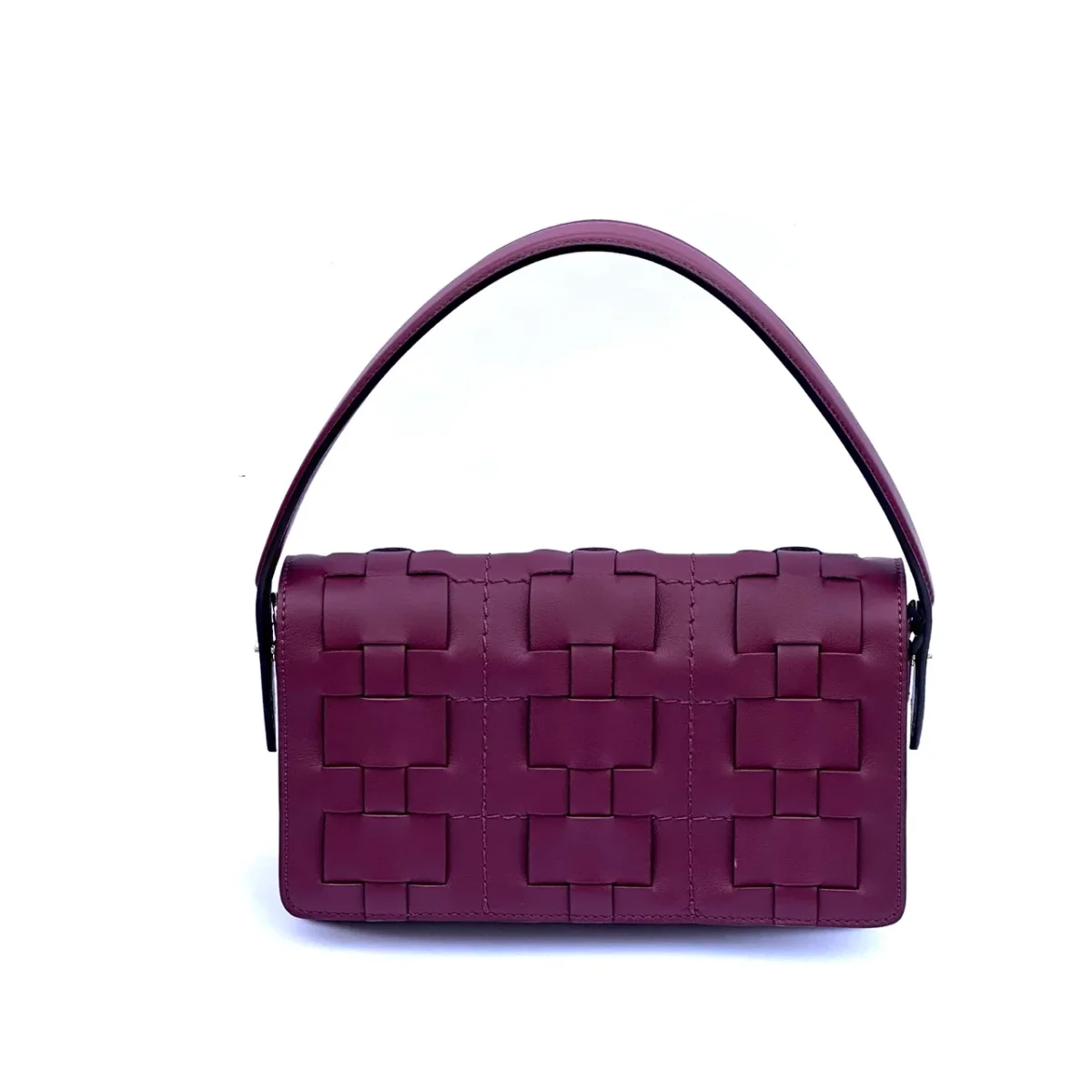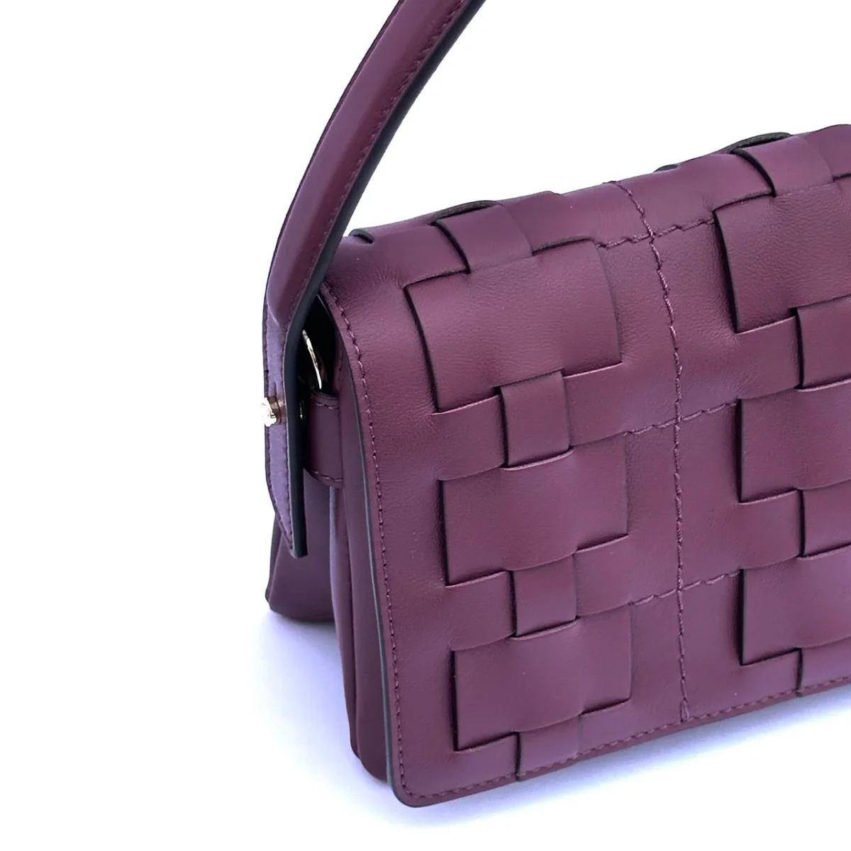 Raffinata borsa in pelle chiusa con patta dalla lavorazione con intreccio. Dotata di un manico corto per essere indossata a spalla e dotata anche di una tracolla lunga e regolabile per essere indossata crossbody.