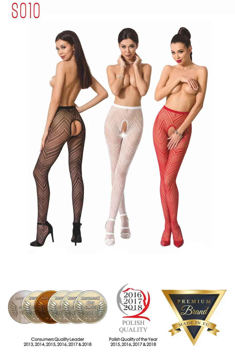 Sensual white tights, open at the crotch, in micro-mesh with elegant geometric zigzag decorations. High-waisted tights with a thin elasticated waistband. Passion Collection