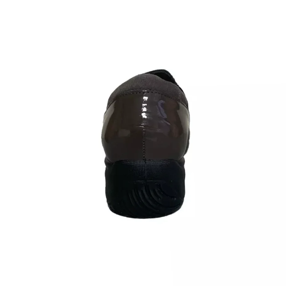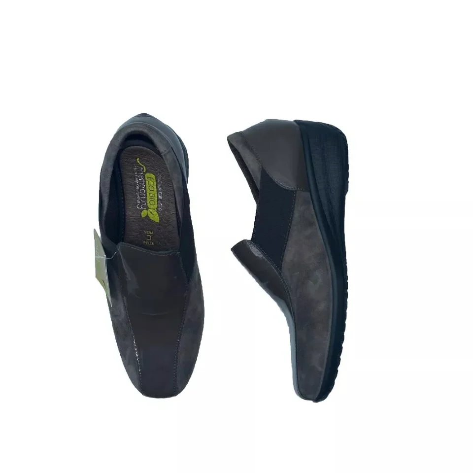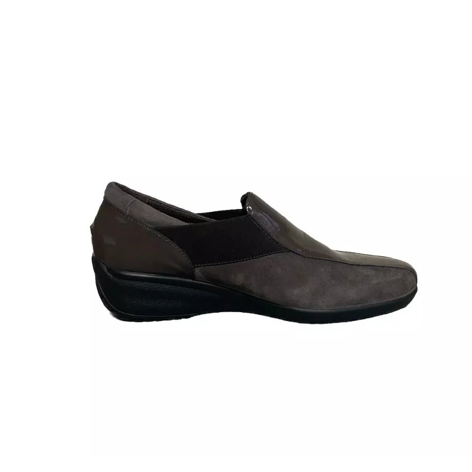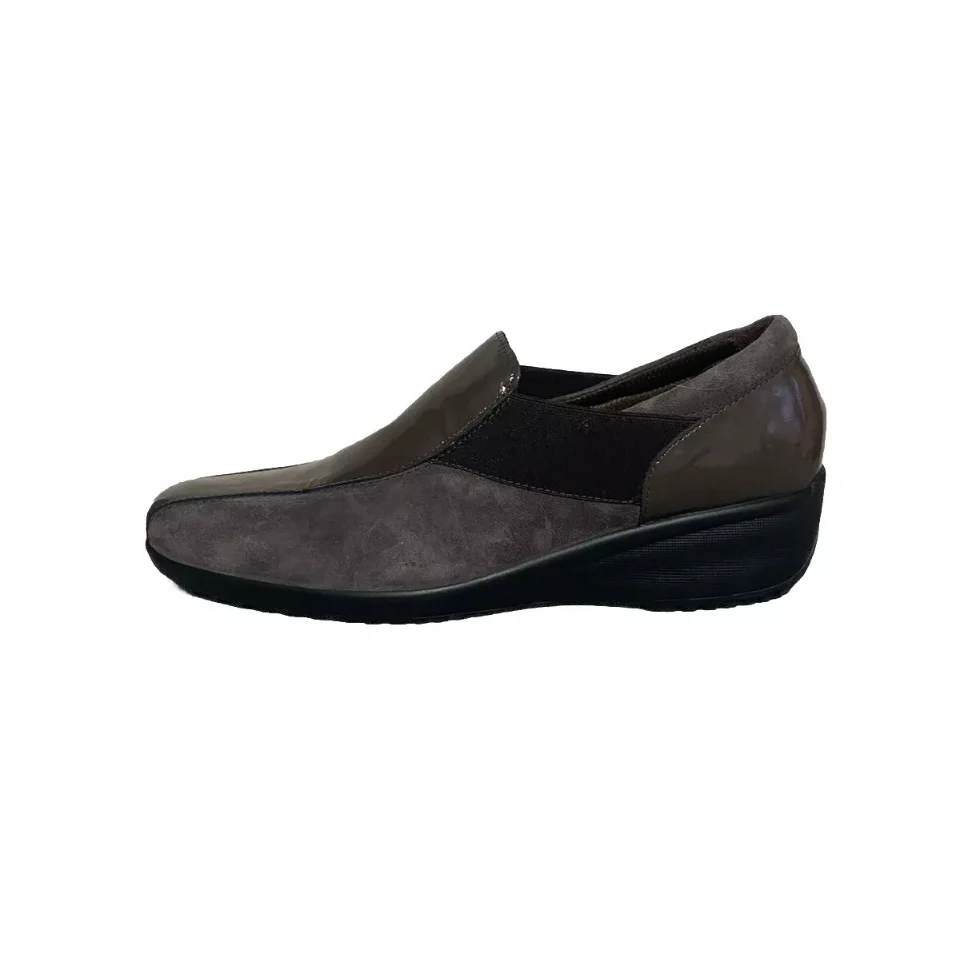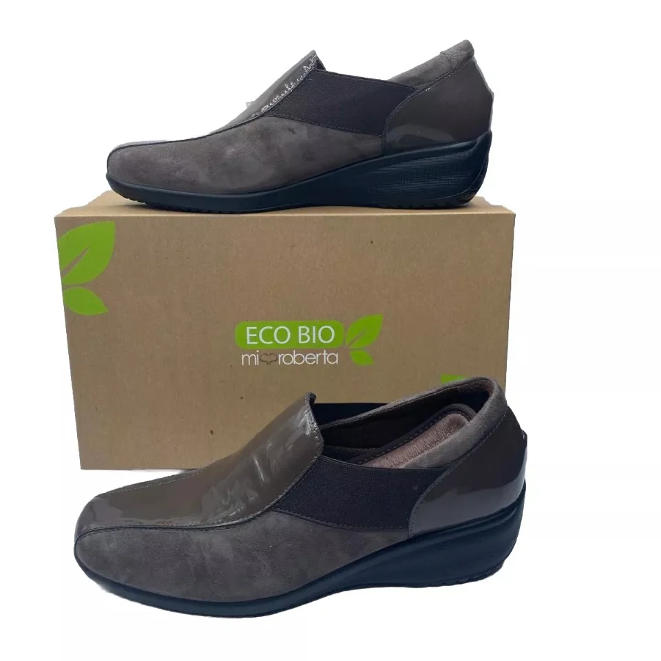 Mocassini MISS ROBERTA ECO BIO moda comoda in vera pelle scamosciata e vernice di colore tupé con elastici laterali per adattarsi al piede