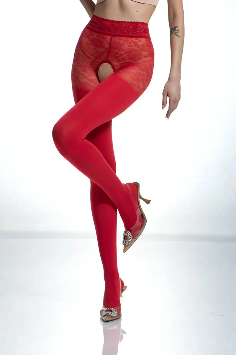 Red tights with an open crotch and a sophisticated, original design that visually evokes the sexy effect of hold-up stockings. Opaque tights (80 denier) with a black glitter stripe down the back and a lace bodice. Silicone-coated lace waistband for a secure fit, hold, and maximum comfort.